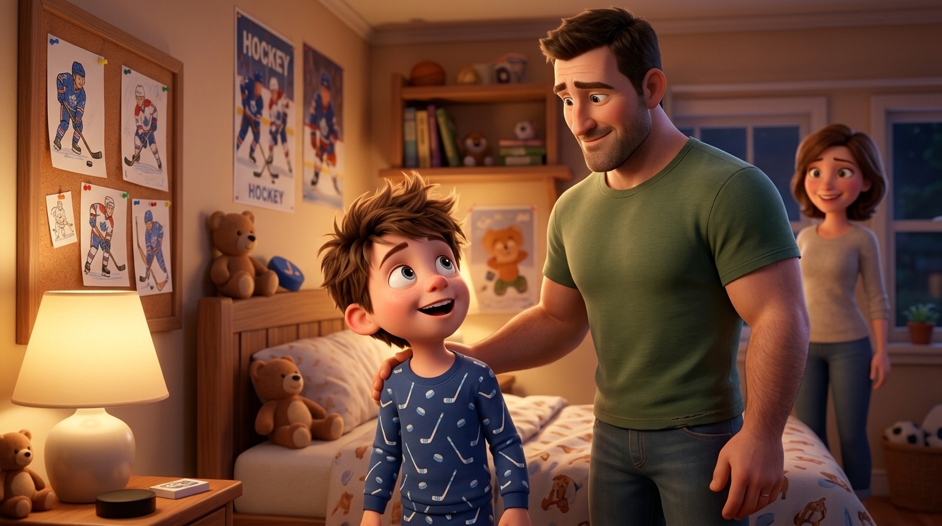 Art style: 3D Pixar. Папа стоит рядом, с гордостью глядя на сына. Он кладет руку Мише на плечо. Вся сцена наполнена семейным теплом и поддержкой. Мама может стоять на заднем плане, счастливо улыбаясь. ━━━━━━━━━━━━━━━━━━━━━━━━━━━━━━━━━━━━━━ FINAL STYLE ENFORCEMENT (this is the authoritative rendering directive — it overrides any style wording elsewhere in the prompt): Render this image entirely in "3D Pixar" style. Match the lighting grammar, material response, colour science, level of realism / stylisation, line weight, and shading model typical of "3D Pixar". Keep the subject, composition, camera angle, lighting direction, and colour palette from the description above — but EVERY surface, skin, fabric, material, and environmental element must be rendered in the "3D Pixar" idiom, not in any other medium. Character appearance reference (MUST match exactly): - Миша: Strong rule: style --- 3D Pixar ---. Мальчик, 6-7 лет, с восторженными глазами и взъерошенными каштановыми волосами. Одет в синюю пижаму с принтом хоккейных клюшек. Энергичный и мечтательный. - Папа: Strong rule: style --- 3D Pixar ---. Мужчина, около 35 лет, с короткой стрижкой и щетиной. Выглядит сильным и добрым. Одет в простую футболку. Гордится своим сыном. - Мама: Strong rule: style --- 3D Pixar ---. Молодая женщина, около 30 лет, с доброй улыбкой и светлыми волосами, собранными в хвост. Одета в уютный домашний свитер. Заботливая и любящая.