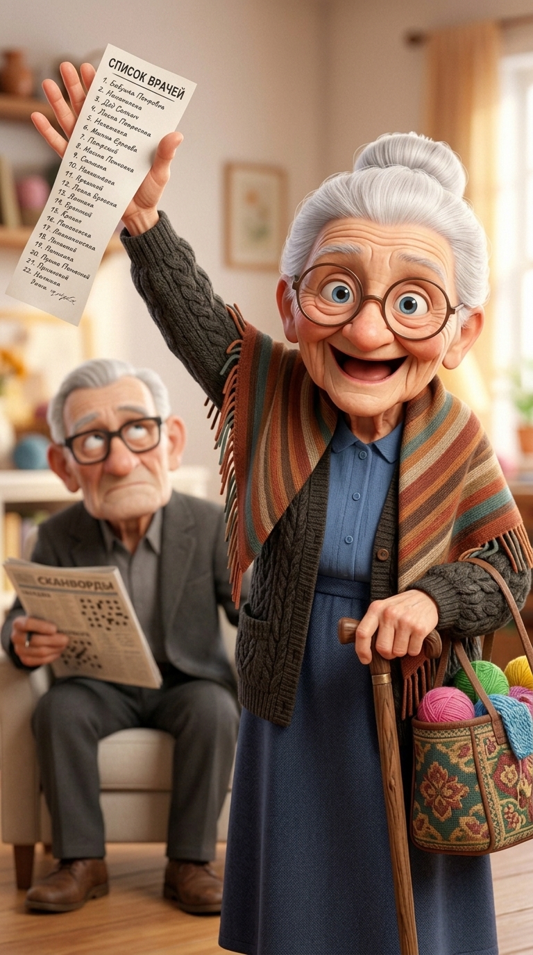 Art style: в стиле 3D-анимации студии Pixar. Крупный план энергичной Бабушки Петровны. Она с энтузиазмом машет бумажным списком врачей. На заднем плане, в расфокусе, видно, как Дед Саныч закатывает глаза. ━━━━━━━━━━━━━━━━━━━━━━━━━━━━━━━━━━━━━━ FINAL STYLE ENFORCEMENT (this is the authoritative rendering directive — it overrides any style wording elsewhere in the prompt): Render this image entirely in "в стиле 3D-анимации студии Pixar" style. Match the lighting grammar, material response, colour science, level of realism / stylisation, line weight, and shading model typical of "в стиле 3D-анимации студии Pixar". Keep the subject, composition, camera angle, lighting direction, and colour palette from the description above — but EVERY surface, skin, fabric, material, and environmental element must be rendered in the "в стиле 3D-анимации студии Pixar" idiom, not in any other medium. Character appearance reference (MUST match exactly): - Бабушка Петровна: Пожилая женщина, добрая бабушка с круглым лицом, покрытым сеточкой морщин, и светлой кожей. У неё большие выразительные голубые глаза за круглыми очками и мягкая, приветливая улыбка. Белоснежные волосы аккуратно уложены в высокий пучок. Она невысокого роста, худощавого телосложения, стоит прямо, слегка опираясь на деревянную трость. Одета в длинное темно-синее платье, серый вязаный кардиган и полосатую шаль с бахромой в теплых землистых и бирюзовых тонах. В руке она держит гобеленовую сумку, наполненную разноцветными клубками пряжи и вязальными спицами. На ногах — практичные черные кроссовки. Поза спокойная и располагающая. - Дед Саныч: Пожилой мужчина в стиле стилизованной 3D-анимации, около 80 лет, с добрым и мудрым выражением лица. У него прямоугольное лицо с выраженными морщинами, крупный нос и большие уши. Короткие седые волосы аккуратно зачесаны назад. Карие глаза смотрят сквозь массивные черные очки в толстой оправе. Мужчина худощавого телосложения, одет в классический темно-серый пиджак, серую рубашку и темные брюки с коричневыми кожаными туфлями. Он сидит в кресле, держа в одной руке газету со сканвордами и ручку, а другой опираясь на резную деревянную трость. Его поза расслабленная, а на лице играет мягкая, теплая улыбка.