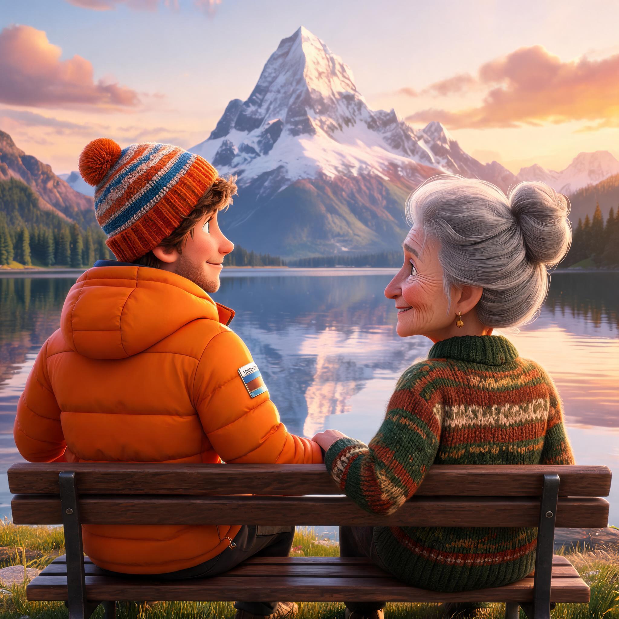 Art style: 3D Pixar. Последний кадр. Лео и Элла сидят на скамейке у спокойного озера. На заднем плане в воде отражается Пик Мечты. Они не говорят, а просто смотрят на гору, как два старых друга. Элла кладет свою руку на руку Лео. ━━━━━━━━━━━━━━━━━━━━━━━━━━━━━━━━━━━━━━ FINAL STYLE ENFORCEMENT (this is the authoritative rendering directive — it overrides any style wording elsewhere in the prompt): Render this image entirely in "3D Pixar" style. Match the lighting grammar, material response, colour science, level of realism / stylisation, line weight, and shading model typical of "3D Pixar". Keep the subject, composition, camera angle, lighting direction, and colour palette from the description above — but EVERY surface, skin, fabric, material, and environmental element must be rendered in the "3D Pixar" idiom, not in any other medium. Character appearance reference (MUST match exactly): - Лео: Strong rule: style --- 3D Pixar ---. Молодой человек лет 20, атлетического телосложения, с добрым, решительным лицом, растрепанными каштановыми волосами и яркими голубыми глазами. Одет в практичную, но яркую альпинистскую одежду: ярко-оранжевая куртка, темные штаны-карго и теплая шапка. - Элла: Strong rule: style --- 3D Pixar ---. Женщина лет 60, с теплой, морщинистой улыбкой и мудрыми серыми глазами. Ее седые волосы собраны в аккуратный пучок. Она одета в уютный вязаный свитер и сидит в удобном кресле, окруженная картами и книгами по альпинизму.