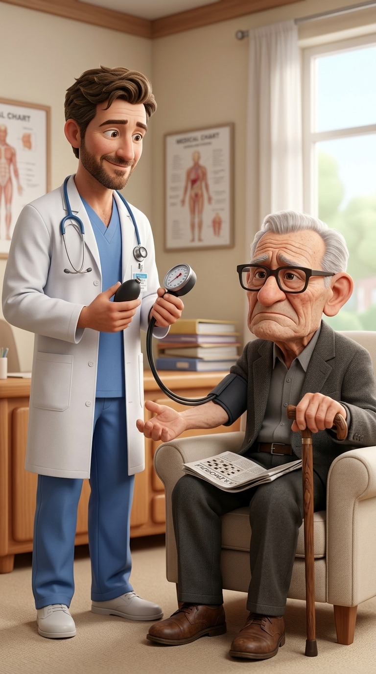 Art style: в стиле 3D-анимации студии Pixar. Доктор Левин доброжелательно улыбается, держа в руках тонометр. Дед Саныч сидит напротив, с выражением вселенской скорби на лице, и медленно, неохотно протягивает руку. ━━━━━━━━━━━━━━━━━━━━━━━━━━━━━━━━━━━━━━ FINAL STYLE ENFORCEMENT (this is the authoritative rendering directive — it overrides any style wording elsewhere in the prompt): Render this image entirely in "в стиле 3D-анимации студии Pixar" style. Match the lighting grammar, material response, colour science, level of realism / stylisation, line weight, and shading model typical of "в стиле 3D-анимации студии Pixar". Keep the subject, composition, camera angle, lighting direction, and colour palette from the description above — but EVERY surface, skin, fabric, material, and environmental element must be rendered in the "в стиле 3D-анимации студии Pixar" idiom, not in any other medium. Character appearance reference (MUST match exactly): - Доктор Левин: Мужчина около 35-40 лет с овальным лицом, четкой челюстью и светлой кожей. У него короткие каштановые волосы, аккуратно уложенные волнами, и ухоженная щетина. Глаза карие, взгляд добрый и уверенный. Спортивное телосложение, рост выше среднего. Одет в синий медицинский костюм и длинный белый халат. На шее висит серый стетоскоп, на нагрудном кармане закреплен бейдж, на левом запястье — классические часы. Он стоит прямо, уверенно глядя в камеру с легкой дружелюбной улыбкой, и держит обеими руками стопку медицинских папок. - Дед Саныч: Пожилой мужчина в стиле стилизованной 3D-анимации, около 80 лет, с добрым и мудрым выражением лица. У него прямоугольное лицо с выраженными морщинами, крупный нос и большие уши. Короткие седые волосы аккуратно зачесаны назад. Карие глаза смотрят сквозь массивные черные очки в толстой оправе. Мужчина худощавого телосложения, одет в классический темно-серый пиджак, серую рубашку и темные брюки с коричневыми кожаными туфлями. Он сидит в кресле, держа в одной руке газету со сканвордами и ручку, а другой опираясь на резную деревянную трость. Его поза расслабленная, а на лице играет мягкая, теплая улыбка. Reference images context (match the visual style and elements from these): - Doctor's Office Interior (general): Interior of a cozy and bright doctor's consultation room in Pixar 3D animation style. Features a large window with soft daylight, light-colored walls, a wooden desk, and medical cabinets. The atmosphere is clean, friendly, and highly detailed with soft rounded edges. High-quality 3D render, Octane render, vibrant but professional colors. - Handwritten Medical List (general): A piece of paper with a handwritten list of medical specialists and tests in Russian Cyrillic text, Pixar 3D animation style. The paper looks slightly handled with soft creases. Close-up shot, isolated on a neutral background, high-quality paper texture, 3D render. - Mechanical Tonometer (general): A stylized mechanical blood pressure monitor (tonometer) with a round dial gauge and a black fabric cuff, Pixar 3D animation style. The gauge has clear numbers and a distinct needle. Materials include matte rubber, polished metal, and glass. Isolated on a plain background, 3D render. - Medical Health Poster (general): A colorful educational health poster designed for a clinic wall, Pixar 3D animation style. Features friendly, stylized diagrams of a heart or human silhouette with bright, simple infographics. Rectangular shape, clean design, isolated on a neutral background. - Doctor's Desk and Chair (general): A professional wooden office desk and a matching chair in Pixar 3D animation style. The desk surface is clean with a slight sheen, featuring a medical chart folder and a pen. Soft edges, warm wood tones, high-quality 3D furniture model, isolated on a neutral background.