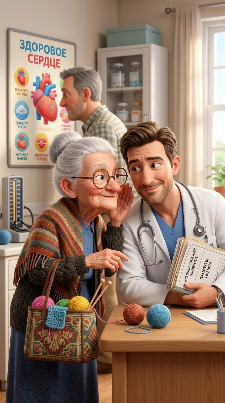 Art style: в стиле 3D-анимации студии Pixar. Бабушка Петровна заговорщицки наклоняется к доктору. Ее глаза хитро блестят. На заднем плане Саныч делает вид, что рассматривает плакат о здоровье на стене. ━━━━━━━━━━━━━━━━━━━━━━━━━━━━━━━━━━━━━━ FINAL STYLE ENFORCEMENT (this is the authoritative rendering directive — it overrides any style wording elsewhere in the prompt): Render this image entirely in "в стиле 3D-анимации студии Pixar" style. Match the lighting grammar, material response, colour science, level of realism / stylisation, line weight, and shading model typical of "в стиле 3D-анимации студии Pixar". Keep the subject, composition, camera angle, lighting direction, and colour palette from the description above — but EVERY surface, skin, fabric, material, and environmental element must be rendered in the "в стиле 3D-анимации студии Pixar" idiom, not in any other medium. Character appearance reference (MUST match exactly): - Бабушка Петровна: Пожилая женщина, добрая бабушка с круглым лицом, покрытым сеточкой морщин, и светлой кожей. У неё большие выразительные голубые глаза за круглыми очками и мягкая, приветливая улыбка. Белоснежные волосы аккуратно уложены в высокий пучок. Она невысокого роста, худощавого телосложения, стоит прямо, слегка опираясь на деревянную трость. Одета в длинное темно-синее платье, серый вязаный кардиган и полосатую шаль с бахромой в теплых землистых и бирюзовых тонах. В руке она держит гобеленовую сумку, наполненную разноцветными клубками пряжи и вязальными спицами. На ногах — практичные черные кроссовки. Поза спокойная и располагающая. - Доктор Левин: Мужчина около 35-40 лет с овальным лицом, четкой челюстью и светлой кожей. У него короткие каштановые волосы, аккуратно уложенные волнами, и ухоженная щетина. Глаза карие, взгляд добрый и уверенный. Спортивное телосложение, рост выше среднего. Одет в синий медицинский костюм и длинный белый халат. На шее висит серый стетоскоп, на нагрудном кармане закреплен бейдж, на левом запястье — классические часы. Он стоит прямо, уверенно глядя в камеру с легкой дружелюбной улыбкой, и держит обеими руками стопку медицинских папок. Reference images context (match the visual style and elements from these): - Doctor's Office Interior (general): Interior of a cozy and bright doctor's consultation room in Pixar 3D animation style. Features a large window with soft daylight, light-colored walls, a wooden desk, and medical cabinets. The atmosphere is clean, friendly, and highly detailed with soft rounded edges. High-quality 3D render, Octane render, vibrant but professional colors. - Mechanical Tonometer (general): A stylized mechanical blood pressure monitor (tonometer) with a round dial gauge and a black fabric cuff, Pixar 3D animation style. The gauge has clear numbers and a distinct needle. Materials include matte rubber, polished metal, and glass. Isolated on a plain background, 3D render. - Medical Health Poster (general): A colorful educational health poster designed for a clinic wall, Pixar 3D animation style. Features friendly, stylized diagrams of a heart or human silhouette with bright, simple infographics. Rectangular shape, clean design, isolated on a neutral background. - Doctor's Desk and Chair (general): A professional wooden office desk and a matching chair in Pixar 3D animation style. The desk surface is clean with a slight sheen, featuring a medical chart folder and a pen. Soft edges, warm wood tones, high-quality 3D furniture model, isolated on a neutral background. - Список медицинских обследований (prop): Листок бумаги с рукописным списком врачей и медицинских анализов на фоне деревянного стола. Бумага имеет следы износа и пятна, что придает ей реалистичный вид личной заметки.