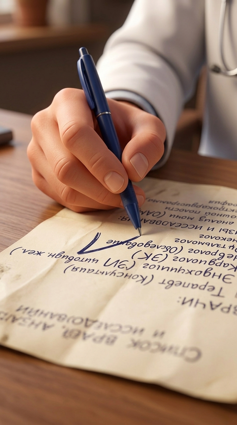 Art style: в стиле 3D-анимации студии Pixar. Супер-крупный план. Рука доктора в белом халате ставит жирную, уверенную галочку в списке напротив пункта "Терапевт". Бумага, ручка, список - все в фокусе. ━━━━━━━━━━━━━━━━━━━━━━━━━━━━━━━━━━━━━━ FINAL STYLE ENFORCEMENT (this is the authoritative rendering directive — it overrides any style wording elsewhere in the prompt): Render this image entirely in "в стиле 3D-анимации студии Pixar" style. Match the lighting grammar, material response, colour science, level of realism / stylisation, line weight, and shading model typical of "в стиле 3D-анимации студии Pixar". Keep the subject, composition, camera angle, lighting direction, and colour palette from the description above — but EVERY surface, skin, fabric, material, and environmental element must be rendered in the "в стиле 3D-анимации студии Pixar" idiom, not in any other medium. Character appearance reference (MUST match exactly): - Доктор Левин: Мужчина около 35-40 лет с овальным лицом, четкой челюстью и светлой кожей. У него короткие каштановые волосы, аккуратно уложенные волнами, и ухоженная щетина. Глаза карие, взгляд добрый и уверенный. Спортивное телосложение, рост выше среднего. Одет в синий медицинский костюм и длинный белый халат. На шее висит серый стетоскоп, на нагрудном кармане закреплен бейдж, на левом запястье — классические часы. Он стоит прямо, уверенно глядя в камеру с легкой дружелюбной улыбкой, и держит обеими руками стопку медицинских папок. Reference images context (match the visual style and elements from these): - Doctor's Office Interior (general): Interior of a cozy and bright doctor's consultation room in Pixar 3D animation style. Features a large window with soft daylight, light-colored walls, a wooden desk, and medical cabinets. The atmosphere is clean, friendly, and highly detailed with soft rounded edges. High-quality 3D render, Octane render, vibrant but professional colors. - Mechanical Tonometer (general): A stylized mechanical blood pressure monitor (tonometer) with a round dial gauge and a black fabric cuff, Pixar 3D animation style. The gauge has clear numbers and a distinct needle. Materials include matte rubber, polished metal, and glass. Isolated on a plain background, 3D render. - Medical Health Poster (general): A colorful educational health poster designed for a clinic wall, Pixar 3D animation style. Features friendly, stylized diagrams of a heart or human silhouette with bright, simple infographics. Rectangular shape, clean design, isolated on a neutral background. - Doctor's Desk and Chair (general): A professional wooden office desk and a matching chair in Pixar 3D animation style. The desk surface is clean with a slight sheen, featuring a medical chart folder and a pen. Soft edges, warm wood tones, high-quality 3D furniture model, isolated on a neutral background. - Список медицинских обследований (prop): Листок бумаги с рукописным списком врачей и медицинских анализов на фоне деревянного стола. Бумага имеет следы износа и пятна, что придает ей реалистичный вид личной заметки.