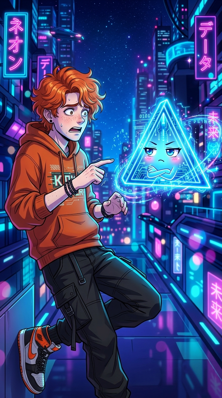 Art style: Anime style, vibrant colors, dynamic lighting, .... Max pointing a trembling finger at the floating triangle. Triki looks unimpressed and sassy with crossed tiny glowing arms. ━━━━━━━━━━━━━━━━━━━━━━━━━━━━━━━━━━━━━━ FINAL STYLE ENFORCEMENT (this is the authoritative rendering directive — it overrides any style wording elsewhere in the prompt): Render this image entirely in "Anime style, vibrant colors, dynamic lighting, ..." style. Match the lighting grammar, material response, colour science, level of realism / stylisation, line weight, and shading model typical of "Anime style, vibrant colors, dynamic lighting, ...". Keep the subject, composition, camera angle, lighting direction, and colour palette from the description above — but EVERY surface, skin, fabric, material, and environmental element must be rendered in the "Anime style, vibrant colors, dynamic lighting, ..." idiom, not in any other medium. Character appearance reference (MUST match exactly): - Трики: Strong rule: style --- Anime style, vibrant colors, dynamic lighting, ... ---. Strong rule: style --- Anime style, vibrant colors, dynamic lighting, ... ---. A glowing neon-blue floating triangle mascot with cute expressive anime eyes and small glowing hands, magical digital aura, hologram style - макс: Подросток мужского пола с острым подбородком и бледной кожей, густо покрытой веснушками. У него пышные, ярко-рыжие вьющиеся волосы средней длины, уложенные в небрежную прическу. Светло-голубые глаза смотрят с хитрым прищуром, на лице играет дерзкая и уверенная ухмылка. Телосложение стройное и атлетичное. Одет в объемное оранжевое худи с надписью «КЛЮЧ CYBER» и цифровым принтом, черные тактические брюки-карго с множеством ремешков и высокие серо-оранжевые кроссовки. Из аксессуаров — черная серьга-гвоздик и плетеные браслеты на запястье. Поза расслабленная, руки спрятаны в переднем кармане худи.