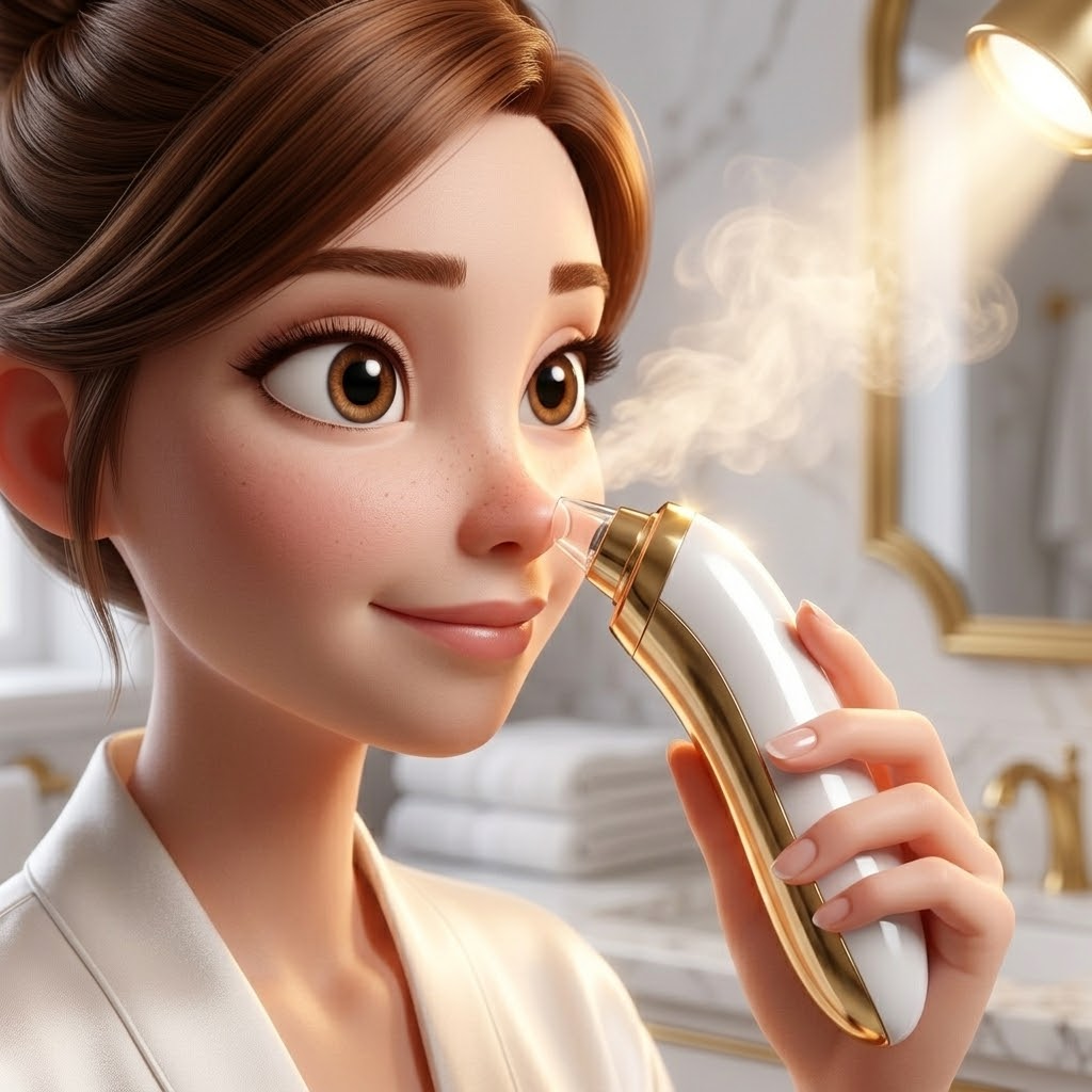 Art style: 3D Pixar. Крупный план изящной руки, держащей стильный эргономичный вакуумный очиститель персонаж Вакуумный аппарат . Прибор поднесен к коже лица в области носа. Вокруг витает легкий пар, создавая эффект спа-процедуры. Освещение яркое, сфокусированное на устройстве, создающее блики на его гладкой поверхности. Атмосфера технологичности и чистоты. Доминирующие цвета золотистого и белого ━━━━━━━━━━━━━━━━━━━━━━━━━━━━━━━━━━━━━━ FINAL STYLE ENFORCEMENT (this is the authoritative rendering directive — it overrides any style wording elsewhere in the prompt): Render this image entirely in "3D Pixar" style. Match the lighting grammar, material response, colour science, level of realism / stylisation, line weight, and shading model typical of "3D Pixar". Keep the subject, composition, camera angle, lighting direction, and colour palette from the description above — but EVERY surface, skin, fabric, material, and environmental element must be rendered in the "3D Pixar" idiom, not in any other medium. Character appearance reference (MUST match exactly): - Анна: Strong rule: style --- 3D Pixar ---. Портрет молодой женщины около двадцати пяти лет с утонченными чертами лица и выразительными карими глазами. У нее гладкие, блестящие каштановые волосы, аккуратно собранные в высокий пучок, открывающий шею. Она одета в элегантный домашний халат из белого натурального шелка. Девушка находится в светлой ванной комнате с отделкой из белого мрамора и золотой фурнитурой. Освещение мягкое и естественное, имитирующее раннее утро, создающее свежий и чистый вид. В ее облике сочетаются естественная красота и стремление к идеальному уходу. Стиль — детальная фотография с мягким фокусом на заднем плане.