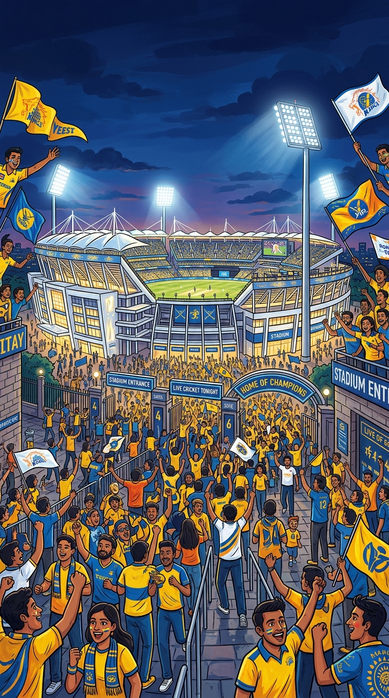 Art style: Madhu. A wide-angle establishing shot of a massive, modern cricket stadium at twilight. The towering white floodlights are switched on, casting a brilliant white glow over the scene. In the foreground, a diverse crowd of fans in yellow and blue jerseys surges toward the entrance gates. Dozens of large team flags are waving rhythmically against a dark indigo sky. The atmosphere is electric and chaotic, with a dominant palette of glowing white, deep blue, and vibrant yellow. ━━━━━━━━━━━━━━━━━━━━━━━━━━━━━━━━━━━━━━ FINAL STYLE ENFORCEMENT (this is the authoritative rendering directive — it overrides any style wording elsewhere in the prompt): Render this image entirely in "Madhu" style. Match the lighting grammar, material response, colour science, level of realism / stylisation, line weight, and shading model typical of "Madhu". Keep the subject, composition, camera angle, lighting direction, and colour palette from the description above — but EVERY surface, skin, fabric, material, and environmental element must be rendered in the "Madhu" idiom, not in any other medium.