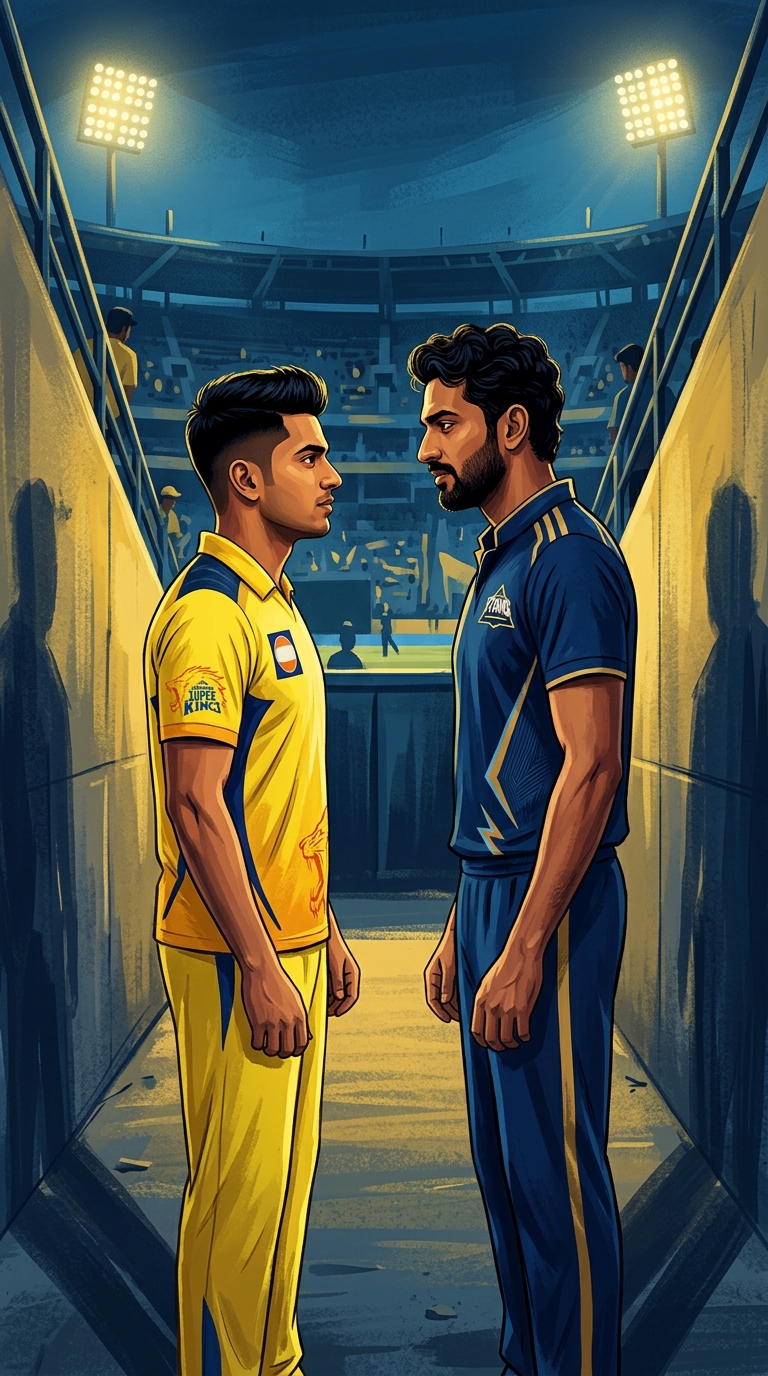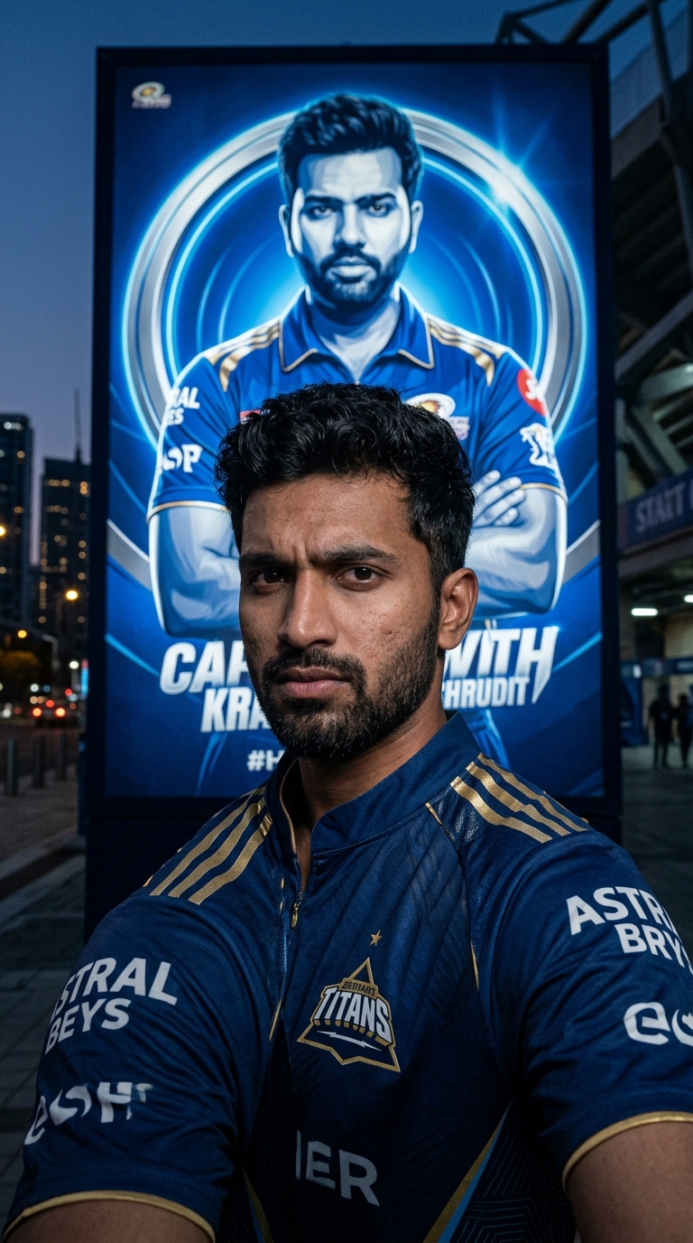 Art style: Madhu. A close-up shot of Madhu standing in front of a giant illuminated poster of a cricket captain. He looks determined, with a slight frown of concentration. The poster behind him glows with blue and white light, framing his head like a halo. The camera angle is low, looking up at him to give him a powerful presence. The dominant colors are electric blue, silver, and dark shadows. ━━━━━━━━━━━━━━━━━━━━━━━━━━━━━━━━━━━━━━ FINAL STYLE ENFORCEMENT (this is the authoritative rendering directive — it overrides any style wording elsewhere in the prompt): Render this image entirely in "Madhu" style. Match the lighting grammar, material response, colour science, level of realism / stylisation, line weight, and shading model typical of "Madhu". Keep the subject, composition, camera angle, lighting direction, and colour palette from the description above — but EVERY surface, skin, fabric, material, and environmental element must be rendered in the "Madhu" idiom, not in any other medium. Character appearance reference (MUST match exactly): - Madhu: A tall Indian man in his mid-20s with a neatly trimmed short beard and dark, wavy hair. He has a playful, mischievous look in his eyes and a smirk on his face. He is wearing a deep navy blue cricket jersey with gold stripes and team branding. He is positioned in a bustling urban environment near a stadium with cool evening light. His energy is calm but competitive, shown in a medium close-up shot. The color palette features rich blues, gold, and the orange glow of city lights.