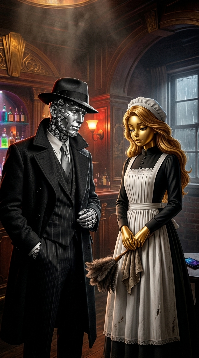 Art style: Cinematic Film Noir Fantasy. Барон убирает руку, но смотрит на Вику с новым, хищным интересом. Он слегка кивает, принимая решение. ━━━━━━━━━━━━━━━━━━━━━━━━━━━━━━━━━━━━━━ FINAL STYLE ENFORCEMENT (this is the authoritative rendering directive — it overrides any style wording elsewhere in the prompt): Render this image entirely in "Cinematic Film Noir Fantasy" style. Match the lighting grammar, material response, colour science, level of realism / stylisation, line weight, and shading model typical of "Cinematic Film Noir Fantasy". Keep the subject, composition, camera angle, lighting direction, and colour palette from the description above — but EVERY surface, skin, fabric, material, and environmental element must be rendered in the "Cinematic Film Noir Fantasy" idiom, not in any other medium. Character appearance reference (MUST match exactly): - Вика: Молодая женщина стройного телосложения с кожей из полированного золота, овальным лицом и печальными золотистыми глазами. Её длинные волнистые золотисто-русые волосы ниспадают из-под белого чепчика горничной. Она одета в традиционное черное платье с длинными рукавами и белый фартук с кружевной отделкой, на котором видны пятна грязи. Выражение её лица меланхоличное, она стоит с поникшим взглядом, сжимая в золотых руках перьевую метелку и тряпку, создавая образ изящного, но печального автомата. - Рубиновый Барон: Strong rule: style --- Cinematic Film Noir Fantasy ---. Харизматичный мужчина, лицо и руки которого выполнены из серебра с вкраплениями ограненных, отполированных алмазных камней, кожа имеет серебристый металлический оттенок; он одет в стильный дорогой костюм. Reference images context (match the visual style and elements from these): - Underground Bar Interior (general): Interior of a secret underground speakeasy bar, cinematic film noir fantasy style, smoky atmosphere, dim amber and red lighting, luxurious art deco architectural details, dark mahogany wood panels, shelves of glowing liquor bottles, highly detailed, wide angle cinematic shot. - Modern Smartphone (general): A sleek modern high-end smartphone with a thin bezel and a glowing screen, black glass finish, isolated on a dark textured surface, cinematic rim lighting, sharp focus, high-tech aesthetic. - Crystal Whiskey Glass (general): A heavy crystal whiskey tumbler with intricate geometric patterns, filled with amber liquid and a single large square ice cube, dramatic rim lighting, film noir aesthetic, condensation on the glass, isolated on a dark polished table. - Leather Wingback Armchair (general): A large vintage wingback armchair made of deep-tufted dark brown leather, worn texture, brass stud details, film noir style, dramatic shadows, isolated against a dark background, cinematic furniture prop. - Gritty Urban Brick Wall (general): A dark weathered red brick wall with wet textures and moss in the cracks, cinematic film noir lighting, deep shadows, gritty urban atmosphere, high detail, isolated background for a dark alleyway.