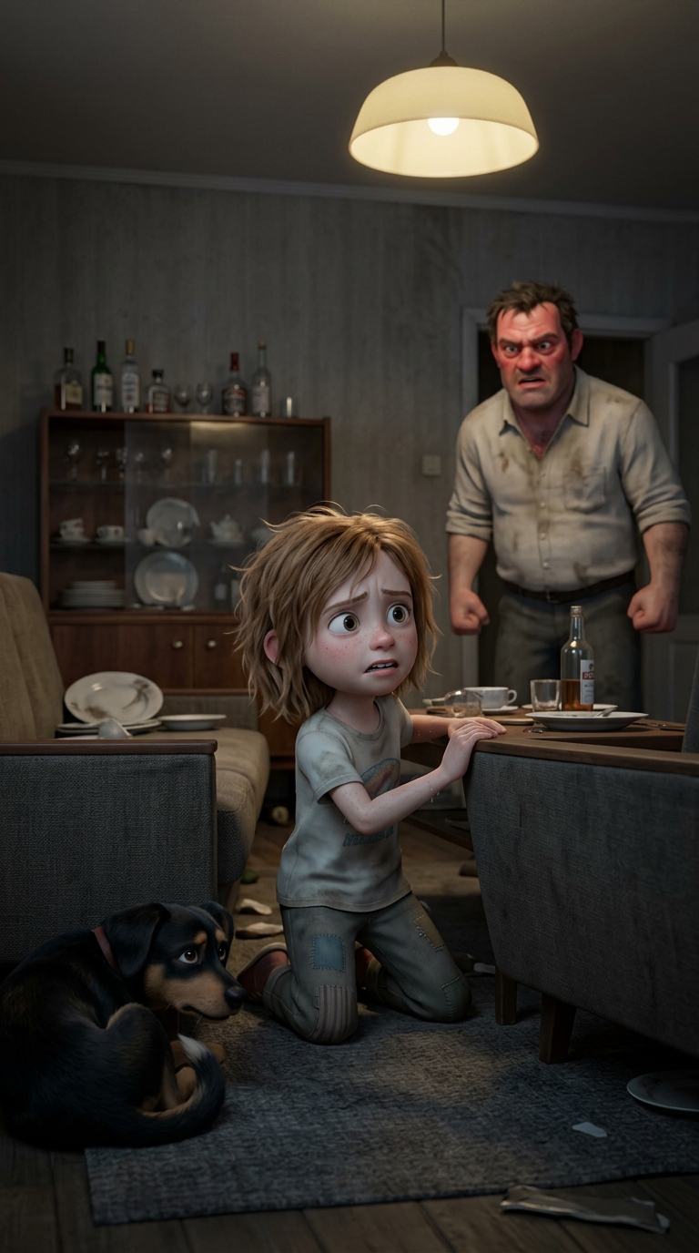 Art style: 3D Pixar. Та же гостиная с сервантом, бутылками. Крупный план с низкого угла, Тася теперь в центре кадра, вылезает из укрытия, стоит на коленях, тело дрожит, взгляд на отца в центре справа. Собака Берта в левом углу скулит, свернувшись. Свет лампы теплеет слегка, тени смягчаются. Атмосфера перехода от укрытия к смелости, серые тона с жёлтым бликом. ━━━━━━━━━━━━━━━━━━━━━━━━━━━━━━━━━━━━━━ FINAL STYLE ENFORCEMENT (this is the authoritative rendering directive — it overrides any style wording elsewhere in the prompt): Render this image entirely in "3D Pixar" style. Match the lighting grammar, material response, colour science, level of realism / stylisation, line weight, and shading model typical of "3D Pixar". Keep the subject, composition, camera angle, lighting direction, and colour palette from the description above — but EVERY surface, skin, fabric, material, and environmental element must be rendered in the "3D Pixar" idiom, not in any other medium. Character appearance reference (MUST match exactly): - Тася: Девочка 8 лет с выразительными большими глазами, полными страха и решимости, худощавого телосложения, с растрёпанными светло-каштановыми волосами до плеч, бледной кожей с лёгкими веснушками, одета в простую потрёпанную детскую одежду 90-х: выцветшая футболка и штаны с заплатами. Лицо с напряжёнными чертами, слегка заикающийся рот, взгляд настороженный и взрослый не по годам. Фон — сумрачная квартира с обшарпанными обоями, тусклый свет от лампы. Атмосфера одиночества и напряжения, тёплые тона с серыми тенями, реалистичный стиль с акцентом на эмоции. - Отец: Мужчина 35-40 лет, крепкого сложения с красным от алкоголя лицом, щетиной, растрёпанными тёмными волосами, налитыми кровью глазами в ярости. Одет в грязную рубашку с расстёгнутым воротником и старые брюки. Руки сжаты в кулаки, поза угрожающая. Фон — захламлённая комната с разбитой посудой. Тусклый свет лампы, создающий жёсткие тени, доминируют красные и серые тона, реалистичный стиль с драматическим освещением.