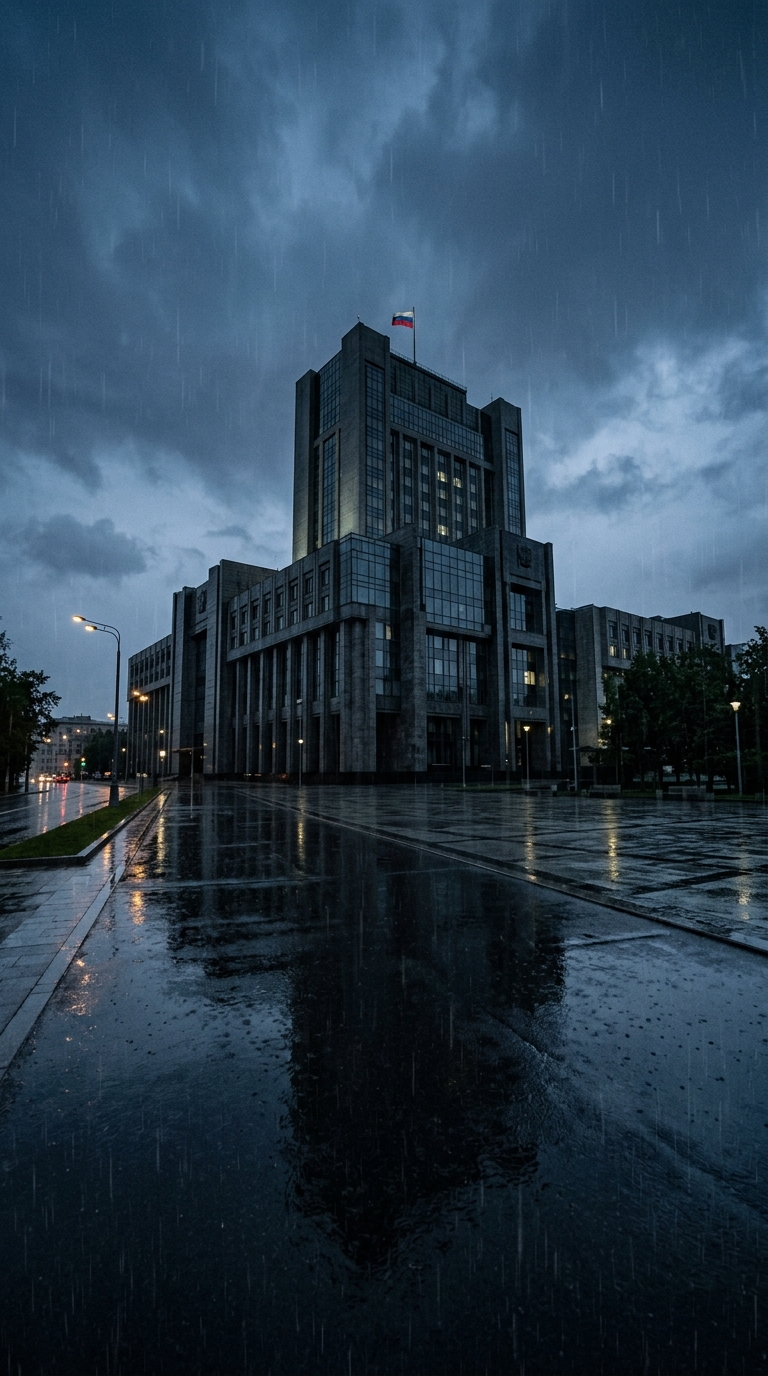 Art style: Cinematic Realism. Кинематографический реализм. Внушительное, современное правительственное здание в Москве в сумерках. Идет дождь, создавая отражения на мокром асфальте. Мрачные, темно-синие и серые тона. Едва заметный российский флаг виден на здании. Без людей. ━━━━━━━━━━━━━━━━━━━━━━━━━━━━━━━━━━━━━━ FINAL STYLE ENFORCEMENT (this is the authoritative rendering directive — it overrides any style wording elsewhere in the prompt): Render this image entirely in "Cinematic Realism" style. Match the lighting grammar, material response, colour science, level of realism / stylisation, line weight, and shading model typical of "Cinematic Realism". Keep the subject, composition, camera angle, lighting direction, and colour palette from the description above — but EVERY surface, skin, fabric, material, and environmental element must be rendered in the "Cinematic Realism" idiom, not in any other medium.