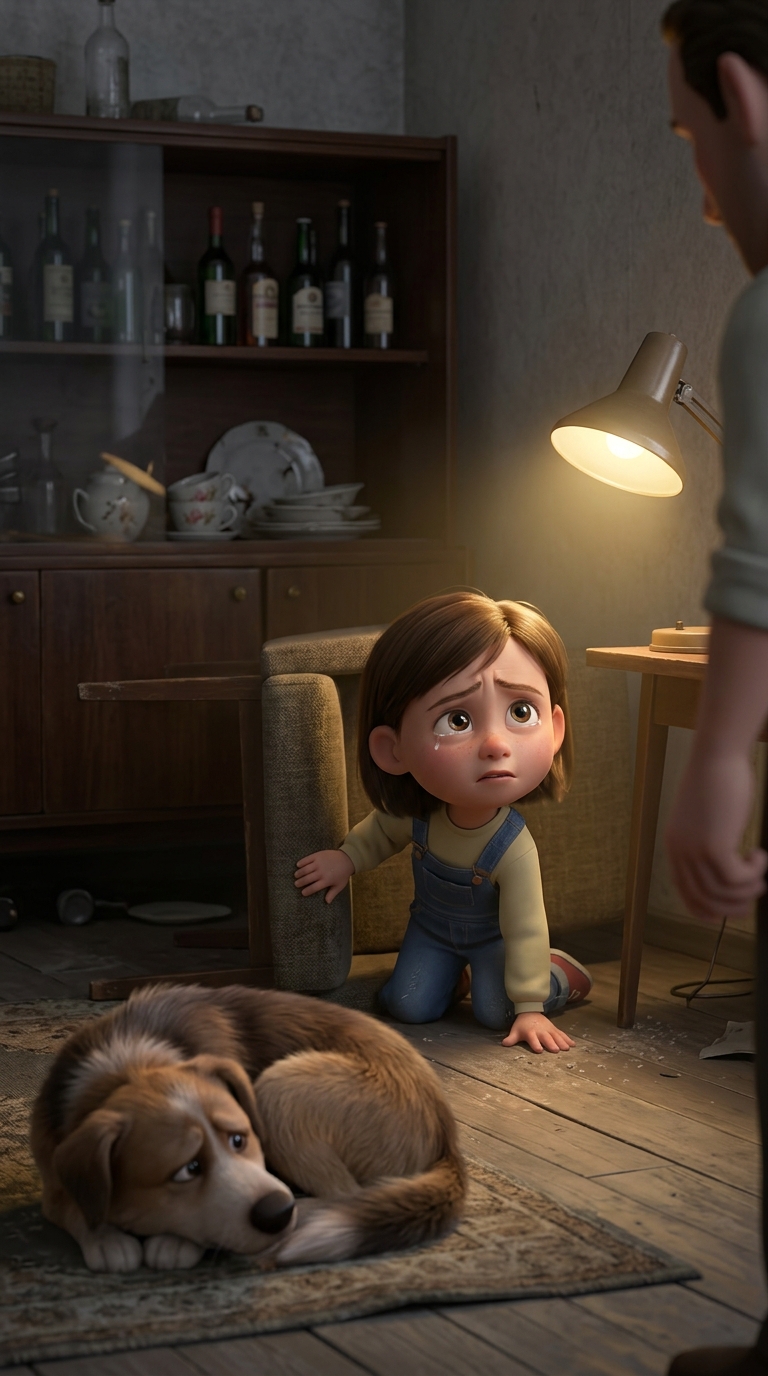 Art style: 3D Pixar. Та же гостиная с сервантом, бутылками. Крупный план с низкого угла, Тася теперь в центре кадра, вылезает из укрытия, стоит на коленях, тело дрожит, взгляд на отца в центре справа. Собака Берта в левом углу скулит, свернувшись. Свет лампы теплеет слегка, тени смягчаются. Атмосфера перехода от укрытия к смелости, серые тона с жёлтым бликом. ━━━━━━━━━━━━━━━━━━━━━━━━━━━━━━━━━━━━━━ FINAL STYLE ENFORCEMENT (this is the authoritative rendering directive — it overrides any style wording elsewhere in the prompt): Render this image entirely in "3D Pixar" style. Match the lighting grammar, material response, colour science, level of realism / stylisation, line weight, and shading model typical of "3D Pixar". Keep the subject, composition, camera angle, lighting direction, and colour palette from the description above — but EVERY surface, skin, fabric, material, and environmental element must be rendered in the "3D Pixar" idiom, not in any other medium. Character appearance reference (MUST match exactly): - Тася: Девочка 8 лет с выразительными большими глазами, полными страха и решимости, худощавого телосложения, с растрёпанными светло-каштановыми волосами до плеч, бледной кожей с лёгкими веснушками, одета в простую потрёпанную детскую одежду 90-х: выцветшая футболка и штаны с заплатами. Лицо с напряжёнными чертами, слегка заикающийся рот, взгляд настороженный и взрослый не по годам. Фон — сумрачная квартира с обшарпанными обоями, тусклый свет от лампы. Атмосфера одиночества и напряжения, тёплые тона с серыми тенями, реалистичный стиль с акцентом на эмоции. - Отец: Мужчина 35-40 лет, крепкого сложения с красным от алкоголя лицом, щетиной, растрёпанными тёмными волосами, налитыми кровью глазами в ярости. Одет в грязную рубашку с расстёгнутым воротником и старые брюки. Руки сжаты в кулаки, поза угрожающая. Фон — захламлённая комната с разбитой посудой. Тусклый свет лампы, создающий жёсткие тени, доминируют красные и серые тона, реалистичный стиль с драматическим освещением.