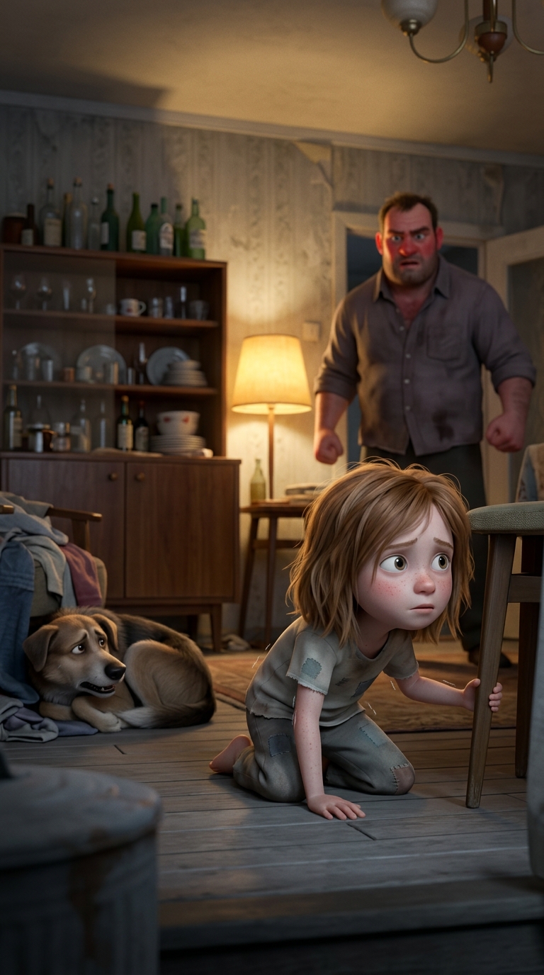 Art style: 3D Pixar. Та же гостиная с сервантом, бутылками. Крупный план с низкого угла, Тася теперь в центре кадра, вылезает из укрытия, стоит на коленях, тело дрожит, взгляд на отца в центре справа. Собака Берта в левом углу скулит, свернувшись. Свет лампы теплеет слегка, тени смягчаются. Атмосфера перехода от укрытия к смелости, серые тона с жёлтым бликом. ━━━━━━━━━━━━━━━━━━━━━━━━━━━━━━━━━━━━━━ FINAL STYLE ENFORCEMENT (this is the authoritative rendering directive — it overrides any style wording elsewhere in the prompt): Render this image entirely in "3D Pixar" style. Match the lighting grammar, material response, colour science, level of realism / stylisation, line weight, and shading model typical of "3D Pixar". Keep the subject, composition, camera angle, lighting direction, and colour palette from the description above — but EVERY surface, skin, fabric, material, and environmental element must be rendered in the "3D Pixar" idiom, not in any other medium. Character appearance reference (MUST match exactly): - Тася: Девочка 8 лет с выразительными большими глазами, полными страха и решимости, худощавого телосложения, с растрёпанными светло-каштановыми волосами до плеч, бледной кожей с лёгкими веснушками, одета в простую потрёпанную детскую одежду 90-х: выцветшая футболка и штаны с заплатами. Лицо с напряжёнными чертами, слегка заикающийся рот, взгляд настороженный и взрослый не по годам. Фон — сумрачная квартира с обшарпанными обоями, тусклый свет от лампы. Атмосфера одиночества и напряжения, тёплые тона с серыми тенями, реалистичный стиль с акцентом на эмоции. - Отец: Мужчина 35-40 лет, крепкого сложения с красным от алкоголя лицом, щетиной, растрёпанными тёмными волосами, налитыми кровью глазами в ярости. Одет в грязную рубашку с расстёгнутым воротником и старые брюки. Руки сжаты в кулаки, поза угрожающая. Фон — захламлённая комната с разбитой посудой. Тусклый свет лампы, создающий жёсткие тени, доминируют красные и серые тона, реалистичный стиль с драматическим освещением.