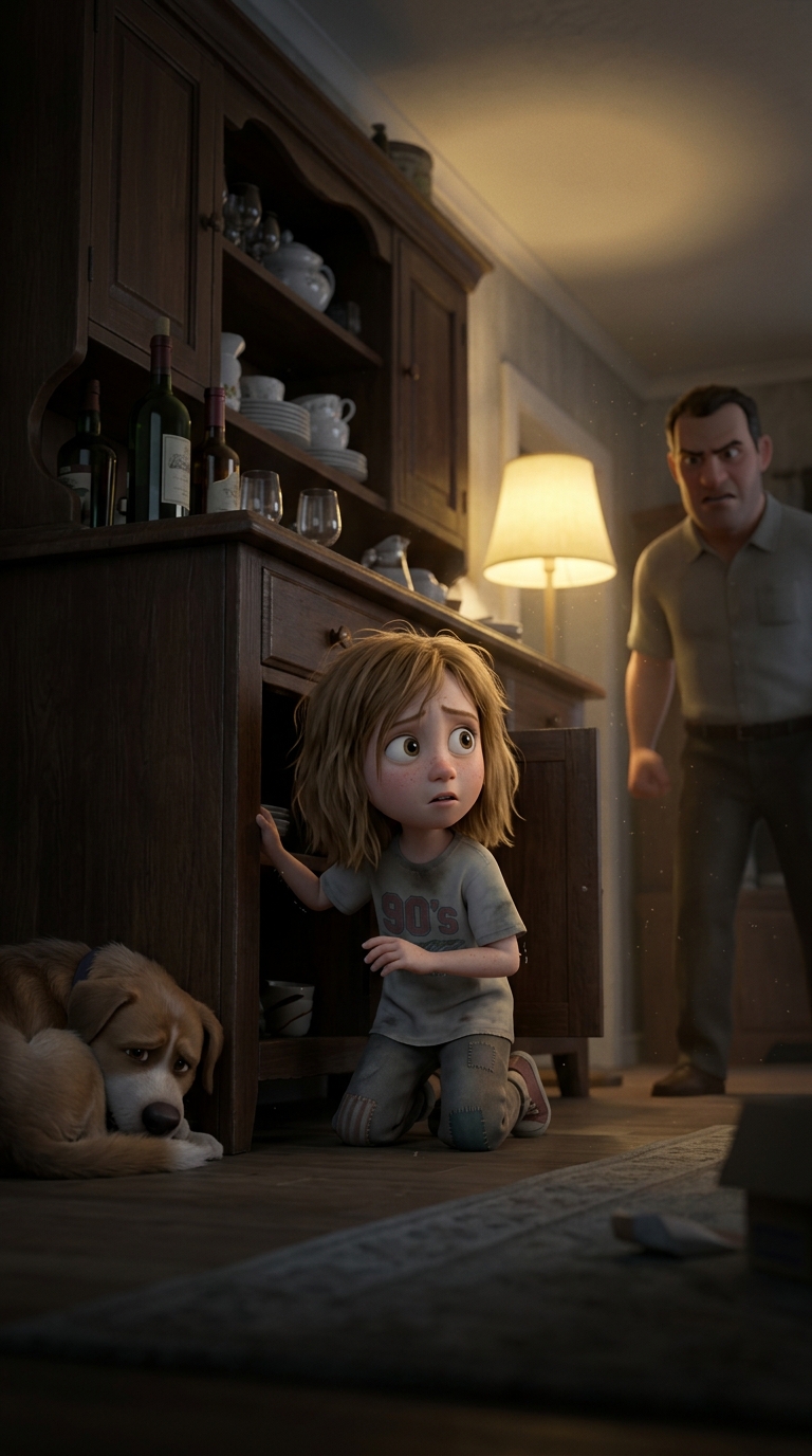 Art style: 3D Pixar. Та же гостиная с сервантом, бутылками. Крупный план с низкого угла, Тася теперь в центре кадра, вылезает из укрытия, стоит на коленях, тело дрожит, взгляд на отца в центре справа. Собака Берта в левом углу скулит, свернувшись. Свет лампы теплеет слегка, тени смягчаются. Атмосфера перехода от укрытия к смелости, серые тона с жёлтым бликом. ━━━━━━━━━━━━━━━━━━━━━━━━━━━━━━━━━━━━━━ FINAL STYLE ENFORCEMENT (this is the authoritative rendering directive — it overrides any style wording elsewhere in the prompt): Render this image entirely in "3D Pixar" style. Match the lighting grammar, material response, colour science, level of realism / stylisation, line weight, and shading model typical of "3D Pixar". Keep the subject, composition, camera angle, lighting direction, and colour palette from the description above — but EVERY surface, skin, fabric, material, and environmental element must be rendered in the "3D Pixar" idiom, not in any other medium. Character appearance reference (MUST match exactly): - Тася: Девочка 8 лет с выразительными большими глазами, полными страха и решимости, худощавого телосложения, с растрёпанными светло-каштановыми волосами до плеч, бледной кожей с лёгкими веснушками, одета в простую потрёпанную детскую одежду 90-х: выцветшая футболка и штаны с заплатами. Лицо с напряжёнными чертами, слегка заикающийся рот, взгляд настороженный и взрослый не по годам. Фон — сумрачная квартира с обшарпанными обоями, тусклый свет от лампы. Атмосфера одиночества и напряжения, тёплые тона с серыми тенями, реалистичный стиль с акцентом на эмоции. - Отец: Мужчина 35-40 лет, крепкого сложения с красным от алкоголя лицом, щетиной, растрёпанными тёмными волосами, налитыми кровью глазами в ярости. Одет в грязную рубашку с расстёгнутым воротником и старые брюки. Руки сжаты в кулаки, поза угрожающая. Фон — захламлённая комната с разбитой посудой. Тусклый свет лампы, создающий жёсткие тени, доминируют красные и серые тона, реалистичный стиль с драматическим освещением.