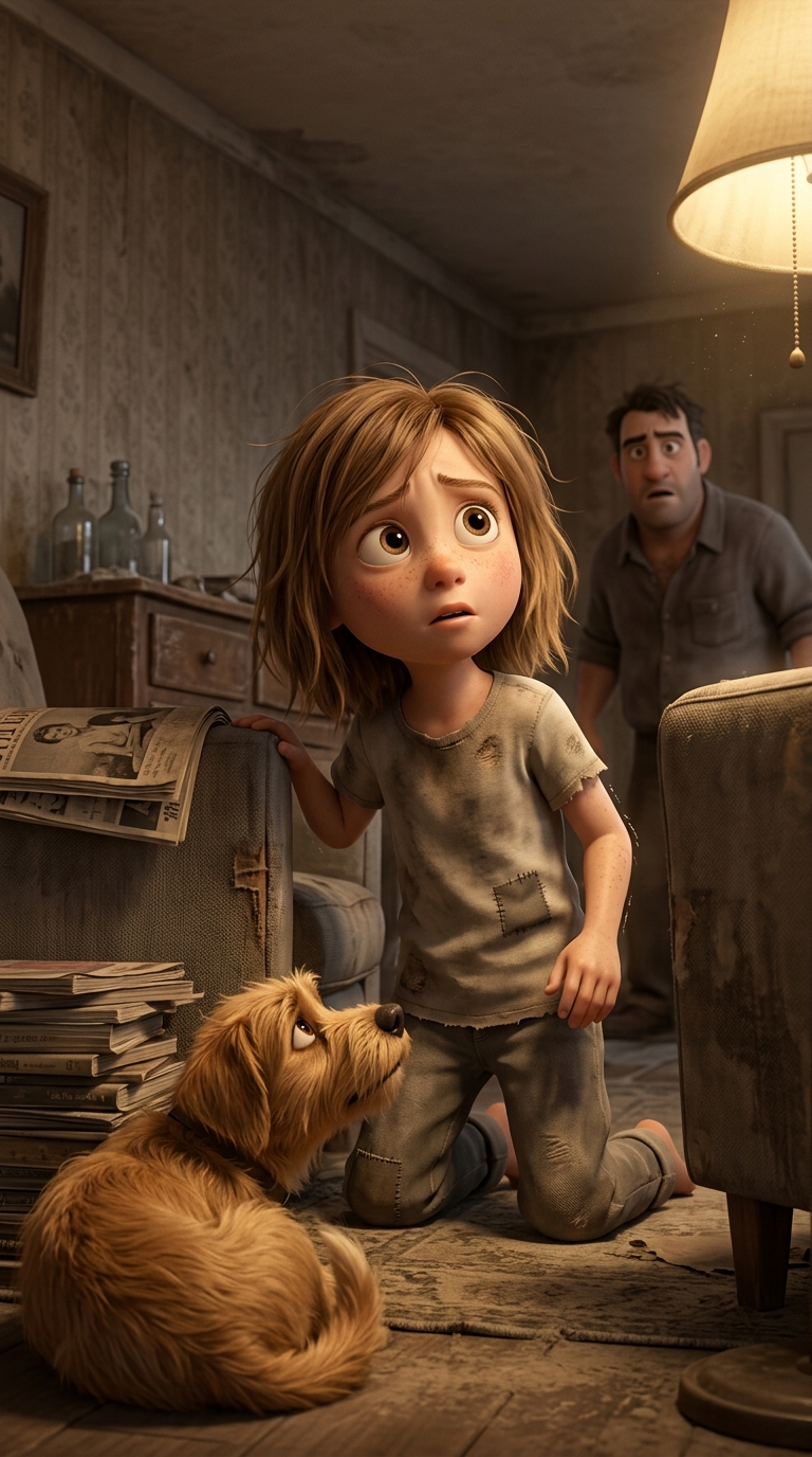 Art style: 3D Pixar. Та же гостиная с сервантом, бутылками. Крупный план с низкого угла, Тася теперь в центре кадра, вылезает из укрытия, стоит на коленях, тело дрожит, взгляд на отца в центре справа. Собака Берта в левом углу скулит, свернувшись. Свет лампы теплеет слегка, тени смягчаются. Атмосфера перехода от укрытия к смелости, серые тона с жёлтым бликом. ━━━━━━━━━━━━━━━━━━━━━━━━━━━━━━━━━━━━━━ FINAL STYLE ENFORCEMENT (this is the authoritative rendering directive — it overrides any style wording elsewhere in the prompt): Render this image entirely in "3D Pixar" style. Match the lighting grammar, material response, colour science, level of realism / stylisation, line weight, and shading model typical of "3D Pixar". Keep the subject, composition, camera angle, lighting direction, and colour palette from the description above — but EVERY surface, skin, fabric, material, and environmental element must be rendered in the "3D Pixar" idiom, not in any other medium. Character appearance reference (MUST match exactly): - Тася: Девочка 8 лет с выразительными большими глазами, полными страха и решимости, худощавого телосложения, с растрёпанными светло-каштановыми волосами до плеч, бледной кожей с лёгкими веснушками, одета в простую потрёпанную детскую одежду 90-х: выцветшая футболка и штаны с заплатами. Лицо с напряжёнными чертами, слегка заикающийся рот, взгляд настороженный и взрослый не по годам. Фон — сумрачная квартира с обшарпанными обоями, тусклый свет от лампы. Атмосфера одиночества и напряжения, тёплые тона с серыми тенями, реалистичный стиль с акцентом на эмоции. - Отец: Мужчина 35-40 лет, крепкого сложения с красным от алкоголя лицом, щетиной, растрёпанными тёмными волосами, налитыми кровью глазами в ярости. Одет в грязную рубашку с расстёгнутым воротником и старые брюки. Руки сжаты в кулаки, поза угрожающая. Фон — захламлённая комната с разбитой посудой. Тусклый свет лампы, создающий жёсткие тени, доминируют красные и серые тона, реалистичный стиль с драматическим освещением.