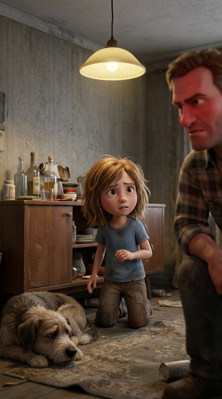 Art style: 3D Pixar. Та же гостиная с сервантом, бутылками. Крупный план с низкого угла, Тася теперь в центре кадра, вылезает из укрытия, стоит на коленях, тело дрожит, взгляд на отца в центре справа. Собака Берта в левом углу скулит, свернувшись. Свет лампы теплеет слегка, тени смягчаются. Атмосфера перехода от укрытия к смелости, серые тона с жёлтым бликом. ━━━━━━━━━━━━━━━━━━━━━━━━━━━━━━━━━━━━━━ FINAL STYLE ENFORCEMENT (this is the authoritative rendering directive — it overrides any style wording elsewhere in the prompt): Render this image entirely in "3D Pixar" style. Match the lighting grammar, material response, colour science, level of realism / stylisation, line weight, and shading model typical of "3D Pixar". Keep the subject, composition, camera angle, lighting direction, and colour palette from the description above — but EVERY surface, skin, fabric, material, and environmental element must be rendered in the "3D Pixar" idiom, not in any other medium. Character appearance reference (MUST match exactly): - Тася: Девочка 8 лет с выразительными большими глазами, полными страха и решимости, худощавого телосложения, с растрёпанными светло-каштановыми волосами до плеч, бледной кожей с лёгкими веснушками, одета в простую потрёпанную детскую одежду 90-х: выцветшая футболка и штаны с заплатами. Лицо с напряжёнными чертами, слегка заикающийся рот, взгляд настороженный и взрослый не по годам. Фон — сумрачная квартира с обшарпанными обоями, тусклый свет от лампы. Атмосфера одиночества и напряжения, тёплые тона с серыми тенями, реалистичный стиль с акцентом на эмоции. - Отец: Мужчина 35-40 лет, крепкого сложения с красным от алкоголя лицом, щетиной, растрёпанными тёмными волосами, налитыми кровью глазами в ярости. Одет в грязную рубашку с расстёгнутым воротником и старые брюки. Руки сжаты в кулаки, поза угрожающая. Фон — захламлённая комната с разбитой посудой. Тусклый свет лампы, создающий жёсткие тени, доминируют красные и серые тона, реалистичный стиль с драматическим освещением.