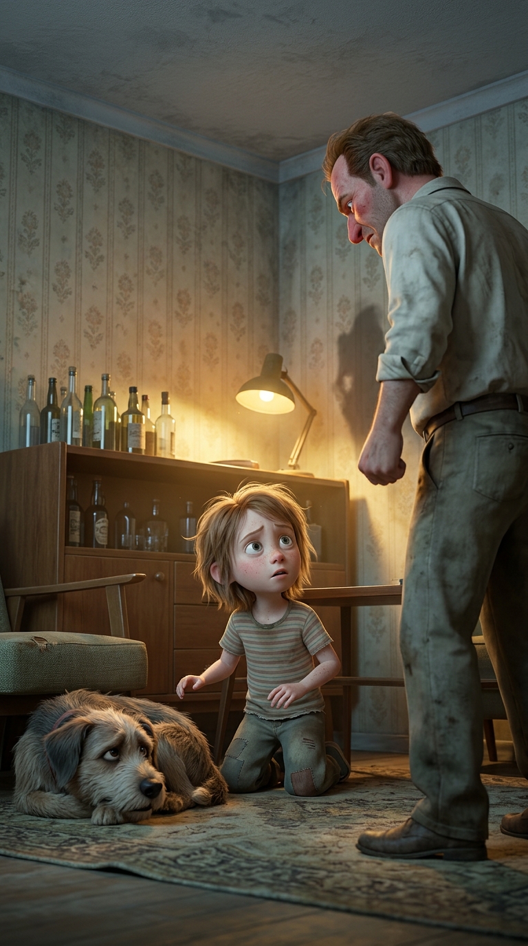 Art style: 3D Pixar. Та же гостиная с сервантом, бутылками. Крупный план с низкого угла, Тася теперь в центре кадра, вылезает из укрытия, стоит на коленях, тело дрожит, взгляд на отца в центре справа. Собака Берта в левом углу скулит, свернувшись. Свет лампы теплеет слегка, тени смягчаются. Атмосфера перехода от укрытия к смелости, серые тона с жёлтым бликом. ━━━━━━━━━━━━━━━━━━━━━━━━━━━━━━━━━━━━━━ FINAL STYLE ENFORCEMENT (this is the authoritative rendering directive — it overrides any style wording elsewhere in the prompt): Render this image entirely in "3D Pixar" style. Match the lighting grammar, material response, colour science, level of realism / stylisation, line weight, and shading model typical of "3D Pixar". Keep the subject, composition, camera angle, lighting direction, and colour palette from the description above — but EVERY surface, skin, fabric, material, and environmental element must be rendered in the "3D Pixar" idiom, not in any other medium. Character appearance reference (MUST match exactly): - Тася: Девочка 8 лет с выразительными большими глазами, полными страха и решимости, худощавого телосложения, с растрёпанными светло-каштановыми волосами до плеч, бледной кожей с лёгкими веснушками, одета в простую потрёпанную детскую одежду 90-х: выцветшая футболка и штаны с заплатами. Лицо с напряжёнными чертами, слегка заикающийся рот, взгляд настороженный и взрослый не по годам. Фон — сумрачная квартира с обшарпанными обоями, тусклый свет от лампы. Атмосфера одиночества и напряжения, тёплые тона с серыми тенями, реалистичный стиль с акцентом на эмоции. - Отец: Мужчина 35-40 лет, крепкого сложения с красным от алкоголя лицом, щетиной, растрёпанными тёмными волосами, налитыми кровью глазами в ярости. Одет в грязную рубашку с расстёгнутым воротником и старые брюки. Руки сжаты в кулаки, поза угрожающая. Фон — захламлённая комната с разбитой посудой. Тусклый свет лампы, создающий жёсткие тени, доминируют красные и серые тона, реалистичный стиль с драматическим освещением.