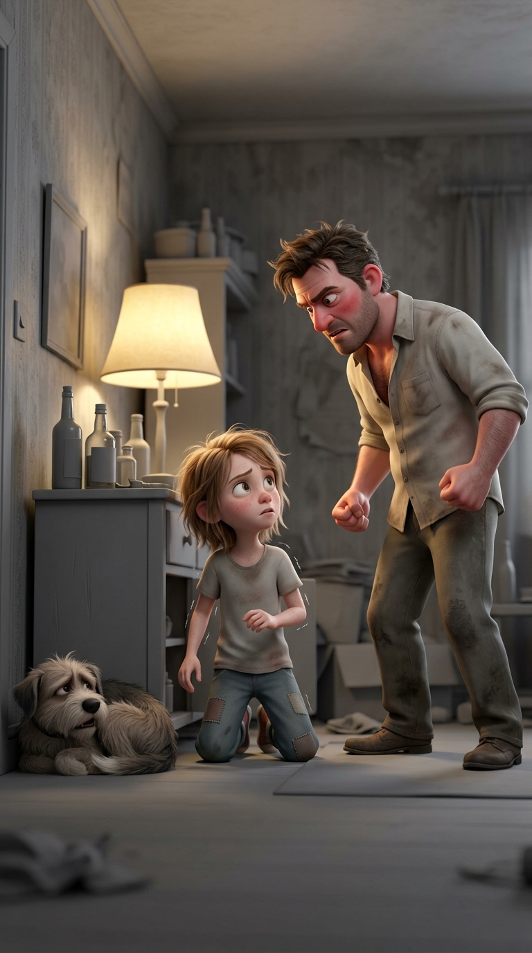 Art style: 3D Pixar. Та же гостиная с сервантом, бутылками. Крупный план с низкого угла, Тася теперь в центре кадра, вылезает из укрытия, стоит на коленях, тело дрожит, взгляд на отца в центре справа. Собака Берта в левом углу скулит, свернувшись. Свет лампы теплеет слегка, тени смягчаются. Атмосфера перехода от укрытия к смелости, серые тона с жёлтым бликом. ━━━━━━━━━━━━━━━━━━━━━━━━━━━━━━━━━━━━━━ FINAL STYLE ENFORCEMENT (this is the authoritative rendering directive — it overrides any style wording elsewhere in the prompt): Render this image entirely in "3D Pixar" style. Match the lighting grammar, material response, colour science, level of realism / stylisation, line weight, and shading model typical of "3D Pixar". Keep the subject, composition, camera angle, lighting direction, and colour palette from the description above — but EVERY surface, skin, fabric, material, and environmental element must be rendered in the "3D Pixar" idiom, not in any other medium. Character appearance reference (MUST match exactly): - Тася: Девочка 8 лет с выразительными большими глазами, полными страха и решимости, худощавого телосложения, с растрёпанными светло-каштановыми волосами до плеч, бледной кожей с лёгкими веснушками, одета в простую потрёпанную детскую одежду 90-х: выцветшая футболка и штаны с заплатами. Лицо с напряжёнными чертами, слегка заикающийся рот, взгляд настороженный и взрослый не по годам. Фон — сумрачная квартира с обшарпанными обоями, тусклый свет от лампы. Атмосфера одиночества и напряжения, тёплые тона с серыми тенями, реалистичный стиль с акцентом на эмоции. - Отец: Мужчина 35-40 лет, крепкого сложения с красным от алкоголя лицом, щетиной, растрёпанными тёмными волосами, налитыми кровью глазами в ярости. Одет в грязную рубашку с расстёгнутым воротником и старые брюки. Руки сжаты в кулаки, поза угрожающая. Фон — захламлённая комната с разбитой посудой. Тусклый свет лампы, создающий жёсткие тени, доминируют красные и серые тона, реалистичный стиль с драматическим освещением.