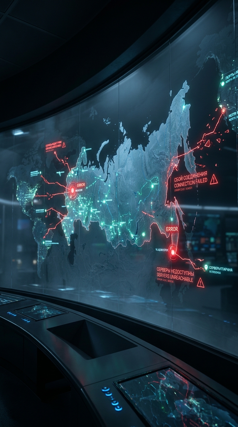 Art style: Cinematic Realism. Кинематографический реализм. Высокотехнологичная цифровая карта России, отображаемая на большом стеклянном экране. Появляются красные узлы ошибок и разорванные линии соединения, неспособные подключиться к серверам за пределами страны. Футуристично, но при этом реалистично. Без людей. ━━━━━━━━━━━━━━━━━━━━━━━━━━━━━━━━━━━━━━ FINAL STYLE ENFORCEMENT (this is the authoritative rendering directive — it overrides any style wording elsewhere in the prompt): Render this image entirely in "Cinematic Realism" style. Match the lighting grammar, material response, colour science, level of realism / stylisation, line weight, and shading model typical of "Cinematic Realism". Keep the subject, composition, camera angle, lighting direction, and colour palette from the description above — but EVERY surface, skin, fabric, material, and environmental element must be rendered in the "Cinematic Realism" idiom, not in any other medium.