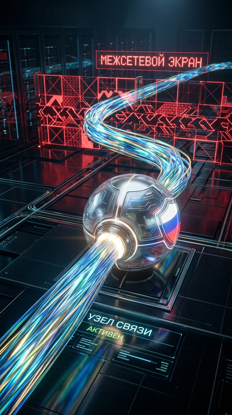 Art style: Cinematic Realism. Кинематографический реализм. Изящная, светящаяся 3D-визуализация потока цифровых данных. Поток данных сначала подключается к защищенному узлу, отмеченному едва заметными цветами российского флага, минуя красный, светящийся цифровой брандмауэр на заднем плане. Высокотехнологичный, премиальный вид. Без людей. Все надписи должны быть на русском языке ━━━━━━━━━━━━━━━━━━━━━━━━━━━━━━━━━━━━━━ FINAL STYLE ENFORCEMENT (this is the authoritative rendering directive — it overrides any style wording elsewhere in the prompt): Render this image entirely in "Cinematic Realism" style. Match the lighting grammar, material response, colour science, level of realism / stylisation, line weight, and shading model typical of "Cinematic Realism". Keep the subject, composition, camera angle, lighting direction, and colour palette from the description above — but EVERY surface, skin, fabric, material, and environmental element must be rendered in the "Cinematic Realism" idiom, not in any other medium.