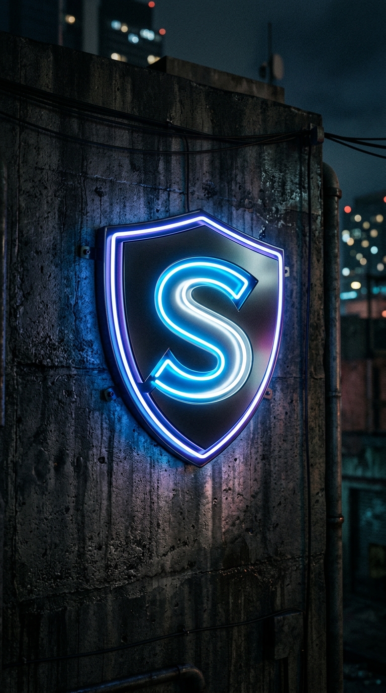 Art style: Cinematic Realism. Кинематографический реализм. Гладкий, светящийся неоновый щит с логотипом S на фоне тёмной, текстурированной бетонной стены. . Высокий контраст, современная эстетика. Без людей. ━━━━━━━━━━━━━━━━━━━━━━━━━━━━━━━━━━━━━━ FINAL STYLE ENFORCEMENT (this is the authoritative rendering directive — it overrides any style wording elsewhere in the prompt): Render this image entirely in "Cinematic Realism" style. Match the lighting grammar, material response, colour science, level of realism / stylisation, line weight, and shading model typical of "Cinematic Realism". Keep the subject, composition, camera angle, lighting direction, and colour palette from the description above — but EVERY surface, skin, fabric, material, and environmental element must be rendered in the "Cinematic Realism" idiom, not in any other medium.