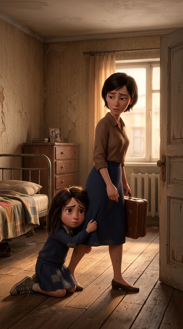 Art style: 3D Pixar. Та же спальня, мама в центре уходит к двери, девочка слева обнимает её ногу в последний раз. Свет теплеет, чемодан закрыт, атмосфера разлуки. Средний план, те же бежевые тона. ━━━━━━━━━━━━━━━━━━━━━━━━━━━━━━━━━━━━━━ FINAL STYLE ENFORCEMENT (this is the authoritative rendering directive — it overrides any style wording elsewhere in the prompt): Render this image entirely in "3D Pixar" style. Match the lighting grammar, material response, colour science, level of realism / stylisation, line weight, and shading model typical of "3D Pixar". Keep the subject, composition, camera angle, lighting direction, and colour palette from the description above — but EVERY surface, skin, fabric, material, and environmental element must be rendered in the "3D Pixar" idiom, not in any other medium. Character appearance reference (MUST match exactly): - Тася: Девочка 8 лет с худощавым телосложением, бледной кожей, большими выразительными глазами полными страха и решимости, тёмными растрёпанными волосами до плеч, одета в простую потрёпанную школьную форму и старые кеды. Лицо с напряжёнными чертами, сжатые губы, взгляд настороженный и твёрдый. Фон — тёмная коммунальная квартира с обшарпанными стенами, сервант и батарея в углу. Мягкое рассеянное освещение от окна, подчёркивающее тени под глазами. Атмосфера одиночества и напряжения, реалистичный стиль портрета с акцентом на эмоции лица, высокая детализация черт и текстуры одежды. - Мама: Женщина 35 лет, стройная, уставшая, с короткими тёмными волосами, строгим взглядом, в простой блузке и юбке. Лицо с морщинами от стресса, губы плотно сжаты. Фон — скромная кухня бабушки с деревянным столом. Холодный дневной свет из окна. Атмосфера усталости и решимости, реалистичный портрет с акцентом на эмоциональную глубину глаз и текстуру кожи.