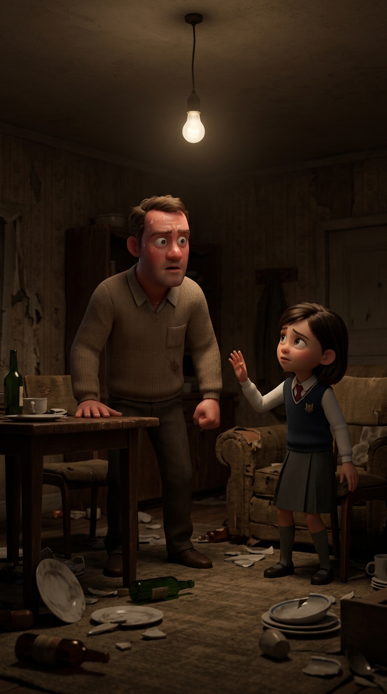Art style: 3D Pixar. Та же гостиная с разбитой посудой, отец теперь в центре кадра опускает кулак, взгляд остекленевший, девочка справа от него встаёт, рука поднята успокаивающе. Свет лампы мигает, тени пляшут, атмосфера затихающего шторма. Средний план, те же тёмно-коричневые тона. ━━━━━━━━━━━━━━━━━━━━━━━━━━━━━━━━━━━━━━ FINAL STYLE ENFORCEMENT (this is the authoritative rendering directive — it overrides any style wording elsewhere in the prompt): Render this image entirely in "3D Pixar" style. Match the lighting grammar, material response, colour science, level of realism / stylisation, line weight, and shading model typical of "3D Pixar". Keep the subject, composition, camera angle, lighting direction, and colour palette from the description above — but EVERY surface, skin, fabric, material, and environmental element must be rendered in the "3D Pixar" idiom, not in any other medium. Character appearance reference (MUST match exactly): - Тася: Девочка 8 лет с худощавым телосложением, бледной кожей, большими выразительными глазами полными страха и решимости, тёмными растрёпанными волосами до плеч, одета в простую потрёпанную школьную форму и старые кеды. Лицо с напряжёнными чертами, сжатые губы, взгляд настороженный и твёрдый. Фон — тёмная коммунальная квартира с обшарпанными стенами, сервант и батарея в углу. Мягкое рассеянное освещение от окна, подчёркивающее тени под глазами. Атмосфера одиночества и напряжения, реалистичный стиль портрета с акцентом на эмоции лица, высокая детализация черт и текстуры одежды. - Отец: Мужчина 40 лет, крепкого телосложения, с красным опухшим лицом, щетиной, спутанными волосами, в мятой рубашке и штанах, глаза налитые кровью в ярости. Руки сжаты в кулаки, поза угрожающая. Фон — захламлённая комната с разбитой посудой и бутылками. Тусклый свет лампы, отбрасывающий жёсткие тени. Атмосфера опасности и хаоса, реалистичный стиль с фокусом на гневном выражении лица, детализация морщин и вен на шее.