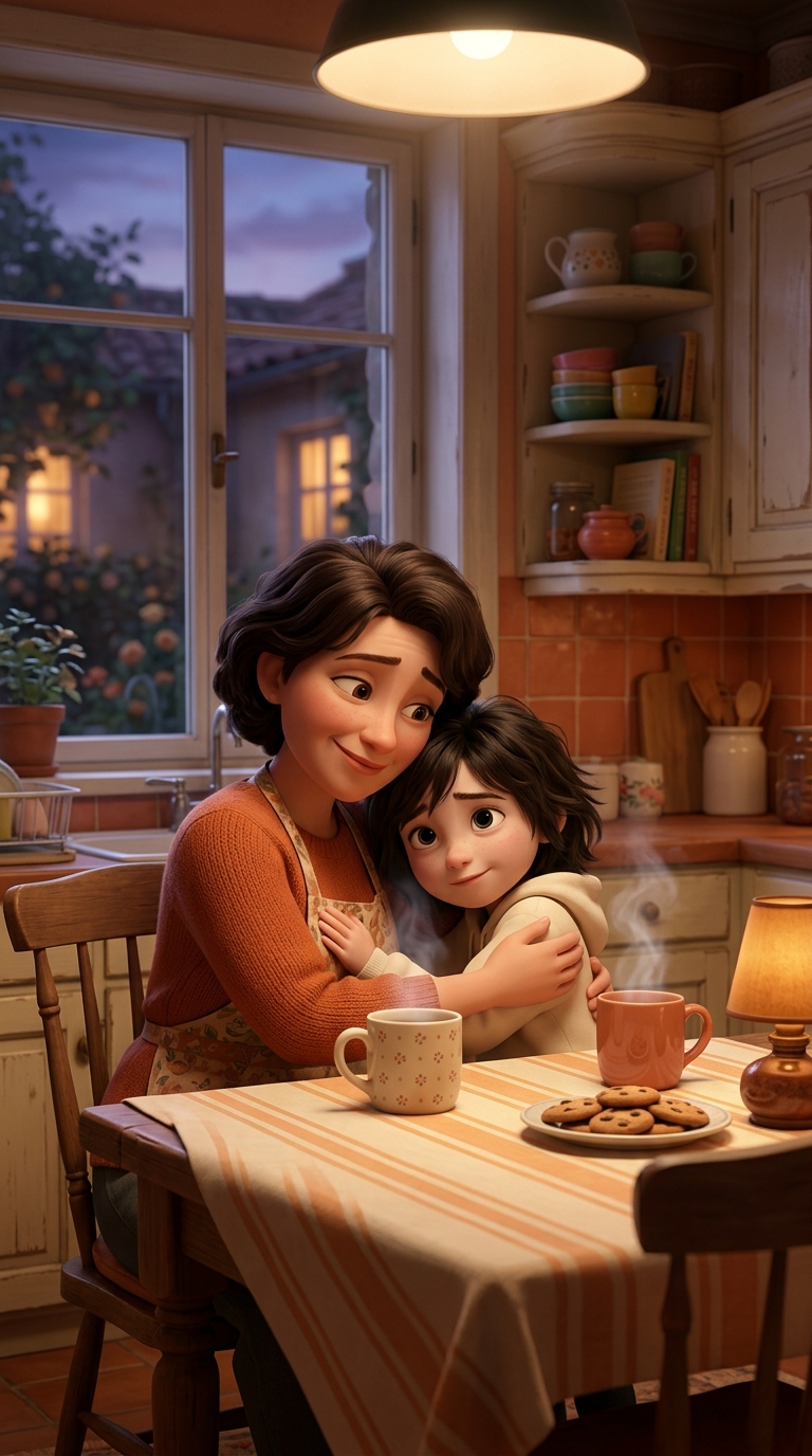 Art style: 3D Pixar. Кухня с столом, чашками и окном во двор, пар от чая. Тёплый вечерний свет лампы, мягкие тени. Атмосфера редкой нежности, мама слева обнимает девочку справа. Крупный план, оранжевые и кремовые тона. ━━━━━━━━━━━━━━━━━━━━━━━━━━━━━━━━━━━━━━ FINAL STYLE ENFORCEMENT (this is the authoritative rendering directive — it overrides any style wording elsewhere in the prompt): Render this image entirely in "3D Pixar" style. Match the lighting grammar, material response, colour science, level of realism / stylisation, line weight, and shading model typical of "3D Pixar". Keep the subject, composition, camera angle, lighting direction, and colour palette from the description above — but EVERY surface, skin, fabric, material, and environmental element must be rendered in the "3D Pixar" idiom, not in any other medium. Character appearance reference (MUST match exactly): - Тася: Девочка 8 лет с худощавым телосложением, бледной кожей, большими выразительными глазами полными страха и решимости, тёмными растрёпанными волосами до плеч, одета в простую потрёпанную школьную форму и старые кеды. Лицо с напряжёнными чертами, сжатые губы, взгляд настороженный и твёрдый. Фон — тёмная коммунальная квартира с обшарпанными стенами, сервант и батарея в углу. Мягкое рассеянное освещение от окна, подчёркивающее тени под глазами. Атмосфера одиночества и напряжения, реалистичный стиль портрета с акцентом на эмоции лица, высокая детализация черт и текстуры одежды. - Мама: Женщина 35 лет, стройная, уставшая, с короткими тёмными волосами, строгим взглядом, в простой блузке и юбке. Лицо с морщинами от стресса, губы плотно сжаты. Фон — скромная кухня бабушки с деревянным столом. Холодный дневной свет из окна. Атмосфера усталости и решимости, реалистичный портрет с акцентом на эмоциональную глубину глаз и текстуру кожи.