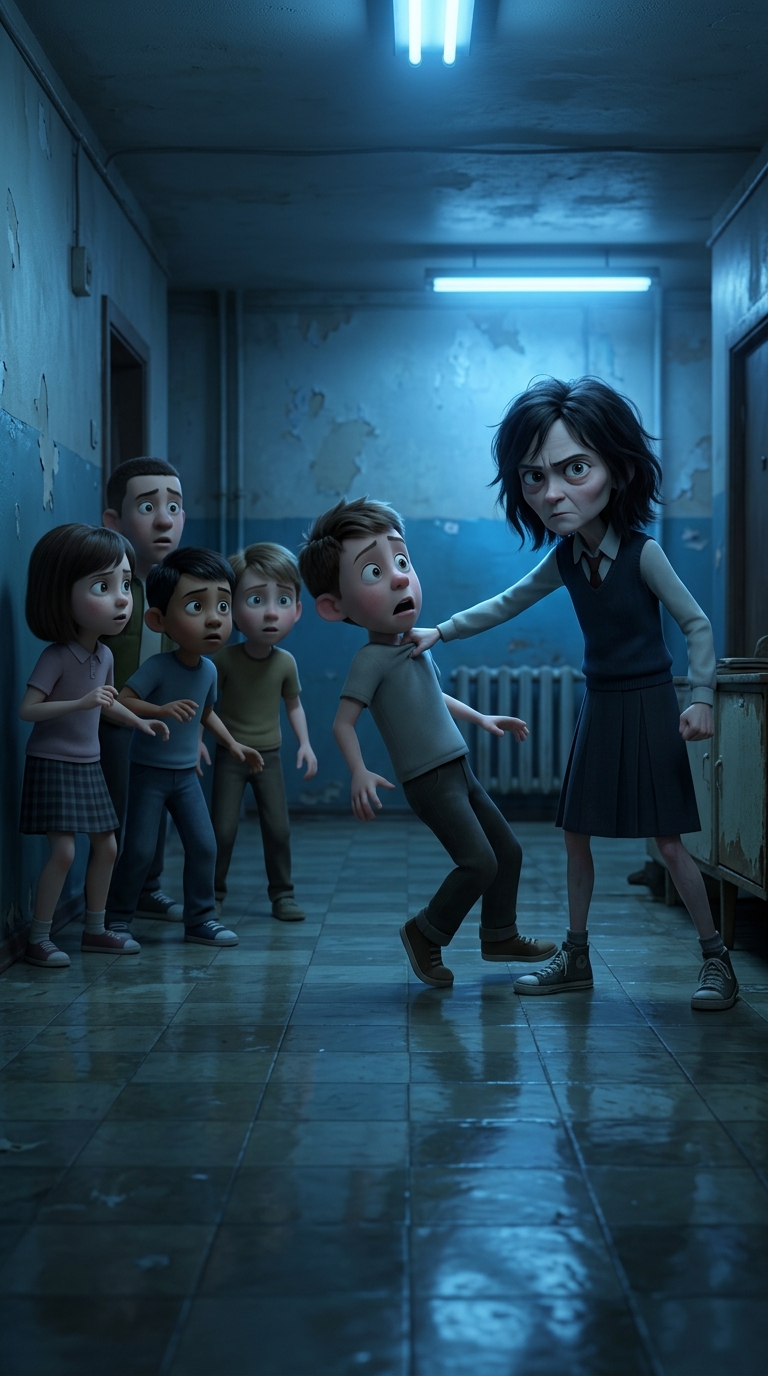 Art style: 3D Pixar. Тот же коридор, девочка справа отталкивает одного ребёнка, группа расступается. Свет отражается от пола, атмосфера доминирования. Средний план, те же синие тона. ━━━━━━━━━━━━━━━━━━━━━━━━━━━━━━━━━━━━━━ FINAL STYLE ENFORCEMENT (this is the authoritative rendering directive — it overrides any style wording elsewhere in the prompt): Render this image entirely in "3D Pixar" style. Match the lighting grammar, material response, colour science, level of realism / stylisation, line weight, and shading model typical of "3D Pixar". Keep the subject, composition, camera angle, lighting direction, and colour palette from the description above — but EVERY surface, skin, fabric, material, and environmental element must be rendered in the "3D Pixar" idiom, not in any other medium. Character appearance reference (MUST match exactly): - Тася: Девочка 8 лет с худощавым телосложением, бледной кожей, большими выразительными глазами полными страха и решимости, тёмными растрёпанными волосами до плеч, одета в простую потрёпанную школьную форму и старые кеды. Лицо с напряжёнными чертами, сжатые губы, взгляд настороженный и твёрдый. Фон — тёмная коммунальная квартира с обшарпанными стенами, сервант и батарея в углу. Мягкое рассеянное освещение от окна, подчёркивающее тени под глазами. Атмосфера одиночества и напряжения, реалистичный стиль портрета с акцентом на эмоции лица, высокая детализация черт и текстуры одежды.