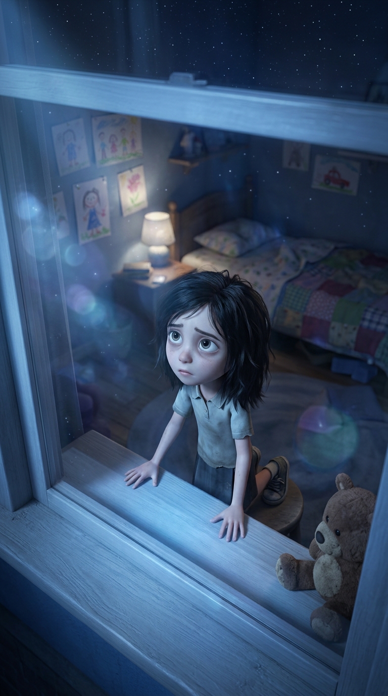 Art style: 3D Pixar. Комната девочки с кроватью, рисунками на стенах и окном на звёзды, плюшевый мишка. Лунный свет через стекло, мечтательные блики. Атмосфера тоски, девочка в нижнем центре у окна смотрит вдаль, руки на подоконнике. Высокий угол, глубокие синие и серебристые тона. ━━━━━━━━━━━━━━━━━━━━━━━━━━━━━━━━━━━━━━ FINAL STYLE ENFORCEMENT (this is the authoritative rendering directive — it overrides any style wording elsewhere in the prompt): Render this image entirely in "3D Pixar" style. Match the lighting grammar, material response, colour science, level of realism / stylisation, line weight, and shading model typical of "3D Pixar". Keep the subject, composition, camera angle, lighting direction, and colour palette from the description above — but EVERY surface, skin, fabric, material, and environmental element must be rendered in the "3D Pixar" idiom, not in any other medium. Character appearance reference (MUST match exactly): - Тася: Девочка 8 лет с худощавым телосложением, бледной кожей, большими выразительными глазами полными страха и решимости, тёмными растрёпанными волосами до плеч, одета в простую потрёпанную школьную форму и старые кеды. Лицо с напряжёнными чертами, сжатые губы, взгляд настороженный и твёрдый. Фон — тёмная коммунальная квартира с обшарпанными стенами, сервант и батарея в углу. Мягкое рассеянное освещение от окна, подчёркивающее тени под глазами. Атмосфера одиночества и напряжения, реалистичный стиль портрета с акцентом на эмоции лица, высокая детализация черт и текстуры одежды.