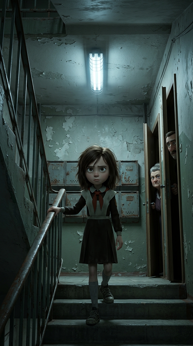 Art style: 3D Pixar. Подъезд хрущёвки с облупившейся краской, почтовыми ящиками и тусклой лампочкой. Холодный флуоресцентный свет, резкие тени. Атмосфера отверженности, девочка в нижнем центре кадра идёт по лестнице вниз, головы соседей справа в дверях. Низкий угол, серо-зелёные тона. ━━━━━━━━━━━━━━━━━━━━━━━━━━━━━━━━━━━━━━ FINAL STYLE ENFORCEMENT (this is the authoritative rendering directive — it overrides any style wording elsewhere in the prompt): Render this image entirely in "3D Pixar" style. Match the lighting grammar, material response, colour science, level of realism / stylisation, line weight, and shading model typical of "3D Pixar". Keep the subject, composition, camera angle, lighting direction, and colour palette from the description above — but EVERY surface, skin, fabric, material, and environmental element must be rendered in the "3D Pixar" idiom, not in any other medium. Character appearance reference (MUST match exactly): - Тася: Девочка 8 лет с худощавым телосложением, бледной кожей, большими выразительными глазами полными страха и решимости, тёмными растрёпанными волосами до плеч, одета в простую потрёпанную школьную форму и старые кеды. Лицо с напряжёнными чертами, сжатые губы, взгляд настороженный и твёрдый. Фон — тёмная коммунальная квартира с обшарпанными стенами, сервант и батарея в углу. Мягкое рассеянное освещение от окна, подчёркивающее тени под глазами. Атмосфера одиночества и напряжения, реалистичный стиль портрета с акцентом на эмоции лица, высокая детализация черт и текстуры одежды.