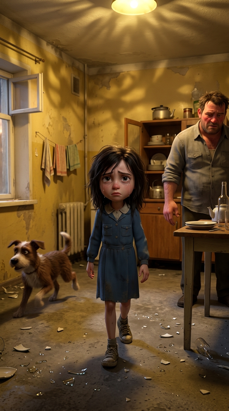 Art style: 3D Pixar. Та же кухня, отец справа опускает руку, собака убегает влево, девочка в центре подходит ближе, лицо в слезах, но решительное. Свет мигает, осколки блестят, атмосфера облегчения. Крупный план, те же жёлтые тона. ━━━━━━━━━━━━━━━━━━━━━━━━━━━━━━━━━━━━━━ FINAL STYLE ENFORCEMENT (this is the authoritative rendering directive — it overrides any style wording elsewhere in the prompt): Render this image entirely in "3D Pixar" style. Match the lighting grammar, material response, colour science, level of realism / stylisation, line weight, and shading model typical of "3D Pixar". Keep the subject, composition, camera angle, lighting direction, and colour palette from the description above — but EVERY surface, skin, fabric, material, and environmental element must be rendered in the "3D Pixar" idiom, not in any other medium. Character appearance reference (MUST match exactly): - Тася: Девочка 8 лет с худощавым телосложением, бледной кожей, большими выразительными глазами полными страха и решимости, тёмными растрёпанными волосами до плеч, одета в простую потрёпанную школьную форму и старые кеды. Лицо с напряжёнными чертами, сжатые губы, взгляд настороженный и твёрдый. Фон — тёмная коммунальная квартира с обшарпанными стенами, сервант и батарея в углу. Мягкое рассеянное освещение от окна, подчёркивающее тени под глазами. Атмосфера одиночества и напряжения, реалистичный стиль портрета с акцентом на эмоции лица, высокая детализация черт и текстуры одежды. - Отец: Мужчина 40 лет, крепкого телосложения, с красным опухшим лицом, щетиной, спутанными волосами, в мятой рубашке и штанах, глаза налитые кровью в ярости. Руки сжаты в кулаки, поза угрожающая. Фон — захламлённая комната с разбитой посудой и бутылками. Тусклый свет лампы, отбрасывающий жёсткие тени. Атмосфера опасности и хаоса, реалистичный стиль с фокусом на гневном выражении лица, детализация морщин и вен на шее.