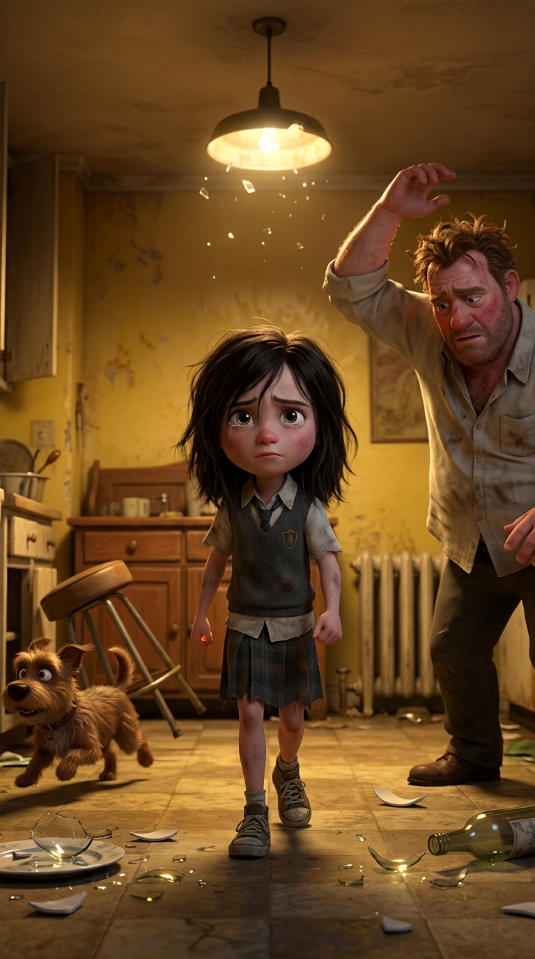 Art style: 3D Pixar. Та же кухня, отец справа опускает руку, собака убегает влево, девочка в центре подходит ближе, лицо в слезах, но решительное. Свет мигает, осколки блестят, атмосфера облегчения. Крупный план, те же жёлтые тона. ━━━━━━━━━━━━━━━━━━━━━━━━━━━━━━━━━━━━━━ FINAL STYLE ENFORCEMENT (this is the authoritative rendering directive — it overrides any style wording elsewhere in the prompt): Render this image entirely in "3D Pixar" style. Match the lighting grammar, material response, colour science, level of realism / stylisation, line weight, and shading model typical of "3D Pixar". Keep the subject, composition, camera angle, lighting direction, and colour palette from the description above — but EVERY surface, skin, fabric, material, and environmental element must be rendered in the "3D Pixar" idiom, not in any other medium. Character appearance reference (MUST match exactly): - Тася: Девочка 8 лет с худощавым телосложением, бледной кожей, большими выразительными глазами полными страха и решимости, тёмными растрёпанными волосами до плеч, одета в простую потрёпанную школьную форму и старые кеды. Лицо с напряжёнными чертами, сжатые губы, взгляд настороженный и твёрдый. Фон — тёмная коммунальная квартира с обшарпанными стенами, сервант и батарея в углу. Мягкое рассеянное освещение от окна, подчёркивающее тени под глазами. Атмосфера одиночества и напряжения, реалистичный стиль портрета с акцентом на эмоции лица, высокая детализация черт и текстуры одежды. - Отец: Мужчина 40 лет, крепкого телосложения, с красным опухшим лицом, щетиной, спутанными волосами, в мятой рубашке и штанах, глаза налитые кровью в ярости. Руки сжаты в кулаки, поза угрожающая. Фон — захламлённая комната с разбитой посудой и бутылками. Тусклый свет лампы, отбрасывающий жёсткие тени. Атмосфера опасности и хаоса, реалистичный стиль с фокусом на гневном выражении лица, детализация морщин и вен на шее.