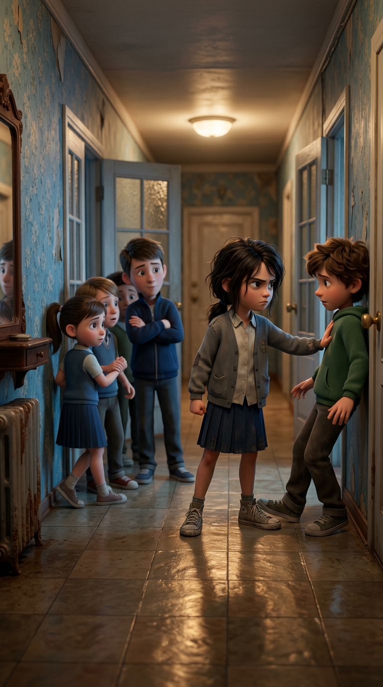 Art style: 3D Pixar. Тот же коридор, девочка справа отталкивает одного ребёнка, группа расступается. Свет отражается от пола, атмосфера доминирования. Средний план, те же синие тона. ━━━━━━━━━━━━━━━━━━━━━━━━━━━━━━━━━━━━━━ FINAL STYLE ENFORCEMENT (this is the authoritative rendering directive — it overrides any style wording elsewhere in the prompt): Render this image entirely in "3D Pixar" style. Match the lighting grammar, material response, colour science, level of realism / stylisation, line weight, and shading model typical of "3D Pixar". Keep the subject, composition, camera angle, lighting direction, and colour palette from the description above — but EVERY surface, skin, fabric, material, and environmental element must be rendered in the "3D Pixar" idiom, not in any other medium. Character appearance reference (MUST match exactly): - Тася: Девочка 8 лет с худощавым телосложением, бледной кожей, большими выразительными глазами полными страха и решимости, тёмными растрёпанными волосами до плеч, одета в простую потрёпанную школьную форму и старые кеды. Лицо с напряжёнными чертами, сжатые губы, взгляд настороженный и твёрдый. Фон — тёмная коммунальная квартира с обшарпанными стенами, сервант и батарея в углу. Мягкое рассеянное освещение от окна, подчёркивающее тени под глазами. Атмосфера одиночества и напряжения, реалистичный стиль портрета с акцентом на эмоции лица, высокая детализация черт и текстуры одежды.