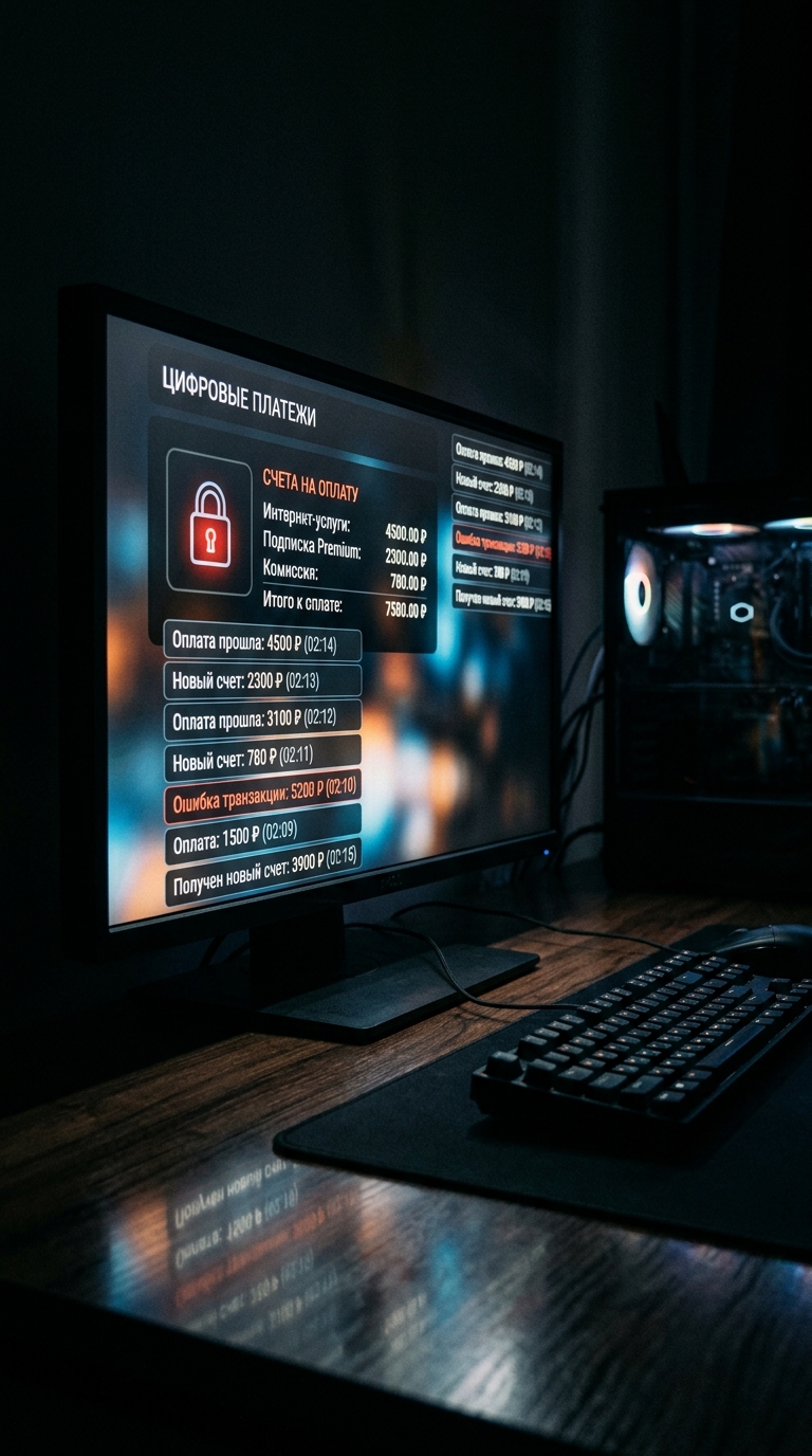 Art style: Cinematic Realism. Кинематографический реализм. Крупный план компьютерного монитора в тёмной комнате. На экране виден цифровой интерфейс выставления счетов с иконкой замка и ценами в рублях (₽). На экран компьютера бесконечно приходят оповещения об оплате. Светящийся экран отражается на тёмном деревянном столе. Высокий контраст, драматическое освещение. Без людей. ━━━━━━━━━━━━━━━━━━━━━━━━━━━━━━━━━━━━━━ FINAL STYLE ENFORCEMENT (this is the authoritative rendering directive — it overrides any style wording elsewhere in the prompt): Render this image entirely in "Cinematic Realism" style. Match the lighting grammar, material response, colour science, level of realism / stylisation, line weight, and shading model typical of "Cinematic Realism". Keep the subject, composition, camera angle, lighting direction, and colour palette from the description above — but EVERY surface, skin, fabric, material, and environmental element must be rendered in the "Cinematic Realism" idiom, not in any other medium.