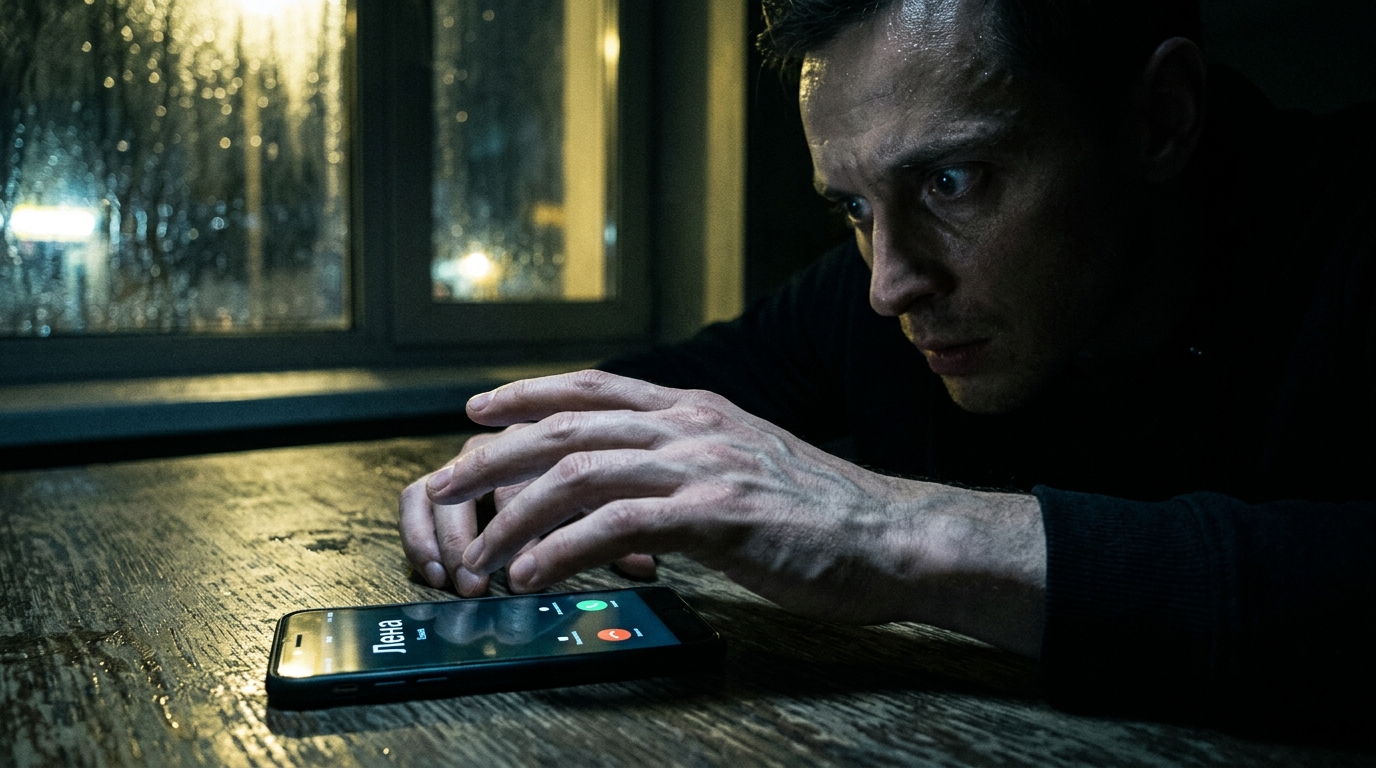 Art style: Психологический триллер, нео-нуар, с элементами.... Крупный план: рука Макса тянется к телефону, но замирает в сантиметре от него, дрожа. Он смотрит на свою руку, потом на телефон, как на ядовитую змею. Внезапно экран телефона вспыхивает входящим звонком: "Лена". Глаза Макса расширяются от удивления. ━━━━━━━━━━━━━━━━━━━━━━━━━━━━━━━━━━━━━━ FINAL STYLE ENFORCEMENT (this is the authoritative rendering directive — it overrides any style wording elsewhere in the prompt): Render this image entirely in "Психологический триллер, нео-нуар, с элементами..." style. Match the lighting grammar, material response, colour science, level of realism / stylisation, line weight, and shading model typical of "Психологический триллер, нео-нуар, с элементами...". Keep the subject, composition, camera angle, lighting direction, and colour palette from the description above — but EVERY surface, skin, fabric, material, and environmental element must be rendered in the "Психологический триллер, нео-нуар, с элементами..." idiom, not in any other medium.
