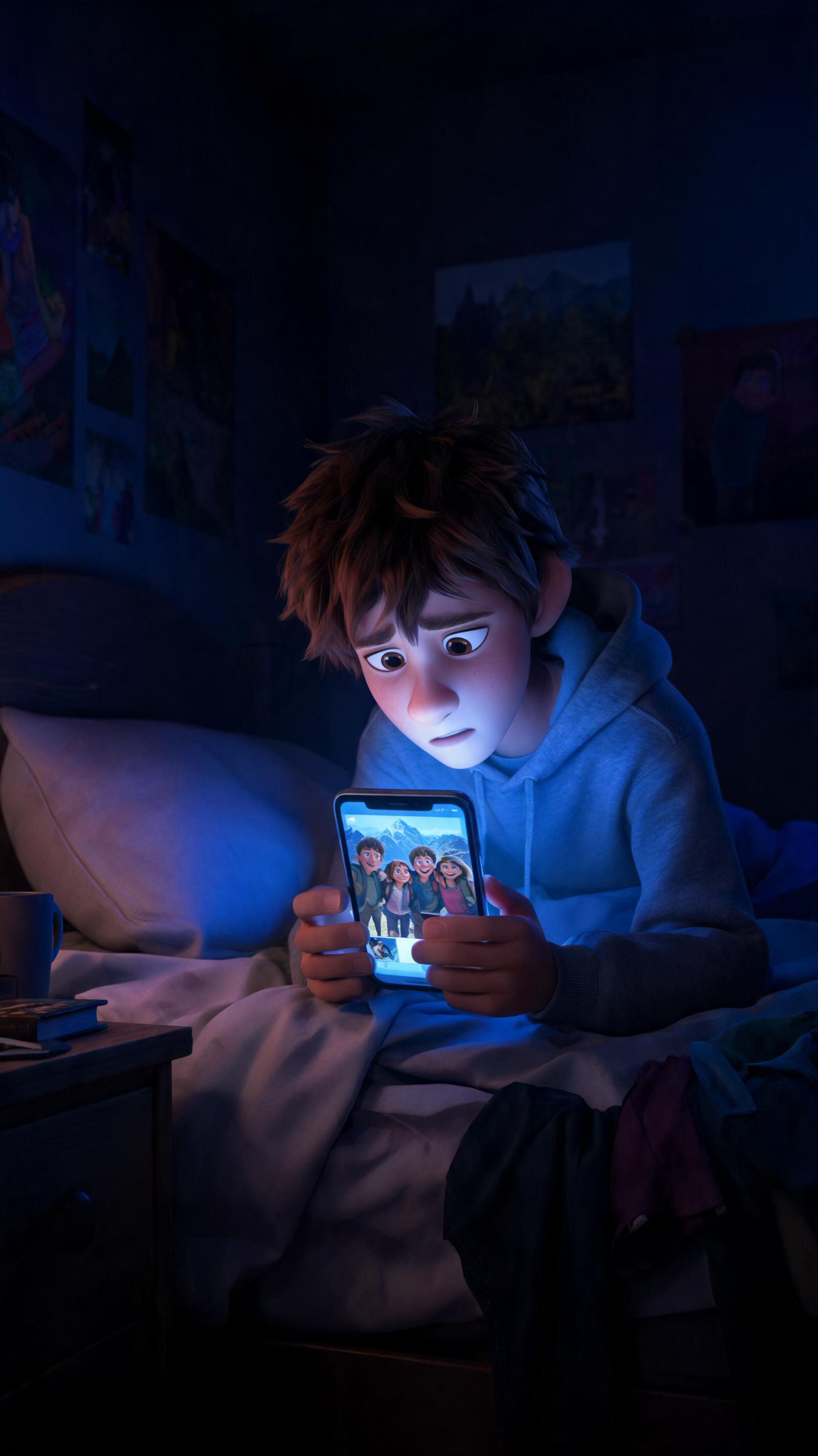 Art style: 3D анимация Pixar. Комната Макса в полумраке, единственный источник света — экран телефона. Макс сидит на кровати, безвольно листая старые фотографии: вот он с друзьями в походе, вот на дне рождения, смеется. Его лицо отражает тоску. Телефон лежит рядом, экран зловеще светится. Стиль: психологический триллер, нео-нуар, контрастное освещение. ━━━━━━━━━━━━━━━━━━━━━━━━━━━━━━━━━━━━━━ FINAL STYLE ENFORCEMENT (this is the authoritative rendering directive — it overrides any style wording elsewhere in the prompt): Render this image entirely in "3D анимация Pixar" style. Match the lighting grammar, material response, colour science, level of realism / stylisation, line weight, and shading model typical of "3D анимация Pixar". Keep the subject, composition, camera angle, lighting direction, and colour palette from the description above — but EVERY surface, skin, fabric, material, and environmental element must be rendered in the "3D анимация Pixar" idiom, not in any other medium.