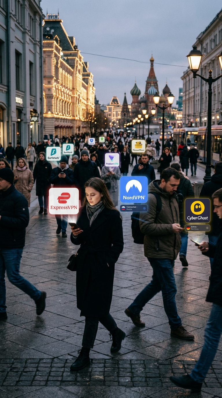 Art style: Cinematic Realism. Кинематографический реализм. Люди ходят по городу Москва и каждый из них пользуется VPN. Иконки различных VPN сервисов появляются над телефонами идущих людей ━━━━━━━━━━━━━━━━━━━━━━━━━━━━━━━━━━━━━━ FINAL STYLE ENFORCEMENT (this is the authoritative rendering directive — it overrides any style wording elsewhere in the prompt): Render this image entirely in "Cinematic Realism" style. Match the lighting grammar, material response, colour science, level of realism / stylisation, line weight, and shading model typical of "Cinematic Realism". Keep the subject, composition, camera angle, lighting direction, and colour palette from the description above — but EVERY surface, skin, fabric, material, and environmental element must be rendered in the "Cinematic Realism" idiom, not in any other medium.