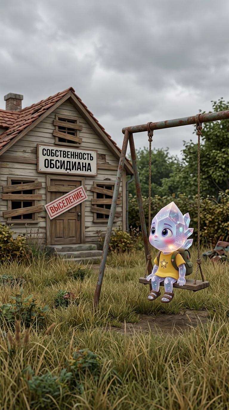 Art style: 3D Pixar Animation. Кварцик в одиночестве сидит на качелях на заброшенном заднем дворе. День пасмурный, небо затянуто серыми тучами. Он смотрит на пустой заколоченный дом с тоской и зарождающейся решимостью в глазах. ━━━━━━━━━━━━━━━━━━━━━━━━━━━━━━━━━━━━━━ FINAL STYLE ENFORCEMENT (this is the authoritative rendering directive — it overrides any style wording elsewhere in the prompt): Render this image entirely in "3D Pixar Animation" style. Match the lighting grammar, material response, colour science, level of realism / stylisation, line weight, and shading model typical of "3D Pixar Animation". Keep the subject, composition, camera angle, lighting direction, and colour palette from the description above — but EVERY surface, skin, fabric, material, and environmental element must be rendered in the "3D Pixar Animation" idiom, not in any other medium. Character appearance reference (MUST match exactly): - Кварцик: Strong rule: style --- 3D Pixar, vibrant colors, highly detailed anthr... ---. Small anthropomorphic Quartz crystal child, wearing a yellow t-shirt and a tiny backpack, huge cute expressive eyes, 3D Pixar style Reference images context (match the visual style and elements from these): - reference photo (general): use as visual reference for setting, objects, and atmosphere - Роскошный черный седан (prop): Черный представительский автомобиль с хромированной решеткой радиатора и многоспицевыми дисками, расположенный в минималистичной студии с мягким теплым освещением. Изображение подчеркивает элегантность и премиальный статус объекта через игру света на глянцевом кузове. - Деревянные качели (prop): Деревянные качели с двумя черными сиденьями на желтых веревках, расположенные на размытом фоне зелени и неба. Конструкция выполнена из светлого дерева с видимой текстурой. - Стилизованная стройплощадка деревянного дома (location): Трехмерная модель строящегося деревянного дома в мультяшном стиле с антропоморфными инструментами на переднем плане. Изображение выполнено в теплых древесных тонах на нежно-голубом фоне, создавая дружелюбную и игровую атмосферу. - Quartz's Cozy Cottage (general): A small, charming cottage in 3D Pixar animation style. Built with warm stone and wood, featuring a gabled roof and a small front porch. The house has an inviting, lived-in feel with soft rounded edges and warm glowing windows. Isolated on a clean white background, highly detailed 3D render. - Backyard Swing Set (general): A simple wooden tree swing in 3D Pixar animation style. A smooth wooden plank seat suspended by two thick, textured ropes. The wood shows a gentle grain and slightly weathered edges. Isolated on a clean white background, vibrant colors, high-quality 3D render. - Eviction Notice and Property Sign (general): A collection of legal documents with a prominent red 'EVICTION' stamp alongside a wooden sign that reads 'PROPERTY OF OBSIDIAN' in bold, sharp black corporate lettering. 3D Pixar animation style, isolated on a white background, high-quality textures. все надписи на русском языке - Neighborhood Street (general): A stylized suburban road in 3D Pixar animation style. Features smooth asphalt, concrete curbs, and elegant street lamps with a warm yellow glow. The environment is clean, slightly whimsical, and peaceful. Isolated perspective, 3D render.