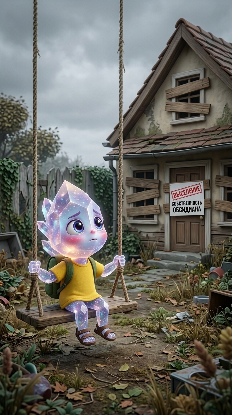 Art style: 3D Pixar Animation. Кварцик в одиночестве сидит на качелях на заброшенном заднем дворе. День пасмурный, небо затянуто серыми тучами. Он смотрит на пустой заколоченный дом с тоской и зарождающейся решимостью в глазах. ━━━━━━━━━━━━━━━━━━━━━━━━━━━━━━━━━━━━━━ FINAL STYLE ENFORCEMENT (this is the authoritative rendering directive — it overrides any style wording elsewhere in the prompt): Render this image entirely in "3D Pixar Animation" style. Match the lighting grammar, material response, colour science, level of realism / stylisation, line weight, and shading model typical of "3D Pixar Animation". Keep the subject, composition, camera angle, lighting direction, and colour palette from the description above — but EVERY surface, skin, fabric, material, and environmental element must be rendered in the "3D Pixar Animation" idiom, not in any other medium. Character appearance reference (MUST match exactly): - Кварцик: Strong rule: style --- 3D Pixar, vibrant colors, highly detailed anthr... ---. Small anthropomorphic Quartz crystal child, wearing a yellow t-shirt and a tiny backpack, huge cute expressive eyes, 3D Pixar style Reference images context (match the visual style and elements from these): - reference photo (general): use as visual reference for setting, objects, and atmosphere - Роскошный черный седан (prop): Черный представительский автомобиль с хромированной решеткой радиатора и многоспицевыми дисками, расположенный в минималистичной студии с мягким теплым освещением. Изображение подчеркивает элегантность и премиальный статус объекта через игру света на глянцевом кузове. - Деревянные качели (prop): Деревянные качели с двумя черными сиденьями на желтых веревках, расположенные на размытом фоне зелени и неба. Конструкция выполнена из светлого дерева с видимой текстурой. - Стилизованная стройплощадка деревянного дома (location): Трехмерная модель строящегося деревянного дома в мультяшном стиле с антропоморфными инструментами на переднем плане. Изображение выполнено в теплых древесных тонах на нежно-голубом фоне, создавая дружелюбную и игровую атмосферу. - Quartz's Cozy Cottage (general): A small, charming cottage in 3D Pixar animation style. Built with warm stone and wood, featuring a gabled roof and a small front porch. The house has an inviting, lived-in feel with soft rounded edges and warm glowing windows. Isolated on a clean white background, highly detailed 3D render. - Backyard Swing Set (general): A simple wooden tree swing in 3D Pixar animation style. A smooth wooden plank seat suspended by two thick, textured ropes. The wood shows a gentle grain and slightly weathered edges. Isolated on a clean white background, vibrant colors, high-quality 3D render. - Eviction Notice and Property Sign (general): A collection of legal documents with a prominent red 'EVICTION' stamp alongside a wooden sign that reads 'PROPERTY OF OBSIDIAN' in bold, sharp black corporate lettering. 3D Pixar animation style, isolated on a white background, high-quality textures. все надписи на русском языке - Neighborhood Street (general): A stylized suburban road in 3D Pixar animation style. Features smooth asphalt, concrete curbs, and elegant street lamps with a warm yellow glow. The environment is clean, slightly whimsical, and peaceful. Isolated perspective, 3D render.