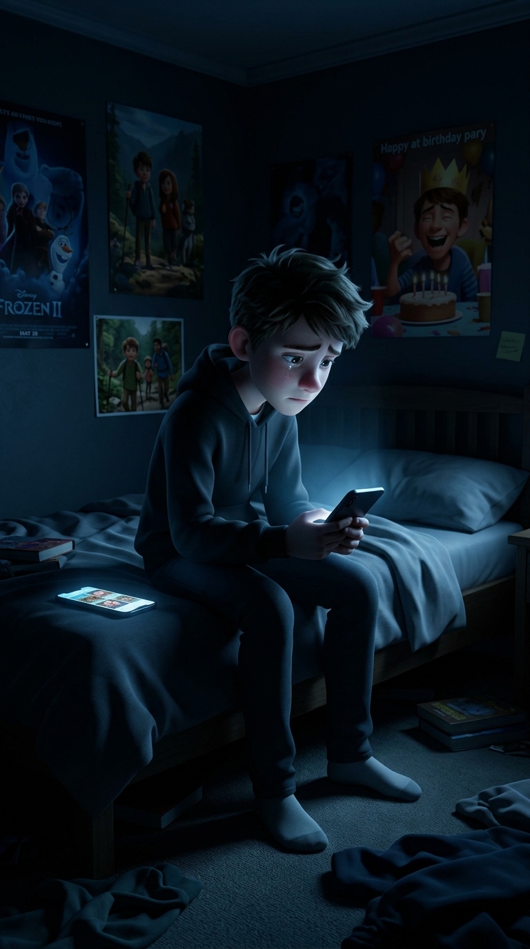 Art style: 3D анимация Pixar. Комната Макса в полумраке, единственный источник света — экран телефона. Макс сидит на кровати, безвольно листая старые фотографии: вот он с друзьями в походе, вот на дне рождения, смеется. Его лицо отражает тоску. Телефон лежит рядом, экран зловеще светится. Стиль: психологический триллер, нео-нуар, контрастное освещение. ━━━━━━━━━━━━━━━━━━━━━━━━━━━━━━━━━━━━━━ FINAL STYLE ENFORCEMENT (this is the authoritative rendering directive — it overrides any style wording elsewhere in the prompt): Render this image entirely in "3D анимация Pixar" style. Match the lighting grammar, material response, colour science, level of realism / stylisation, line weight, and shading model typical of "3D анимация Pixar". Keep the subject, composition, camera angle, lighting direction, and colour palette from the description above — but EVERY surface, skin, fabric, material, and environmental element must be rendered in the "3D анимация Pixar" idiom, not in any other medium.