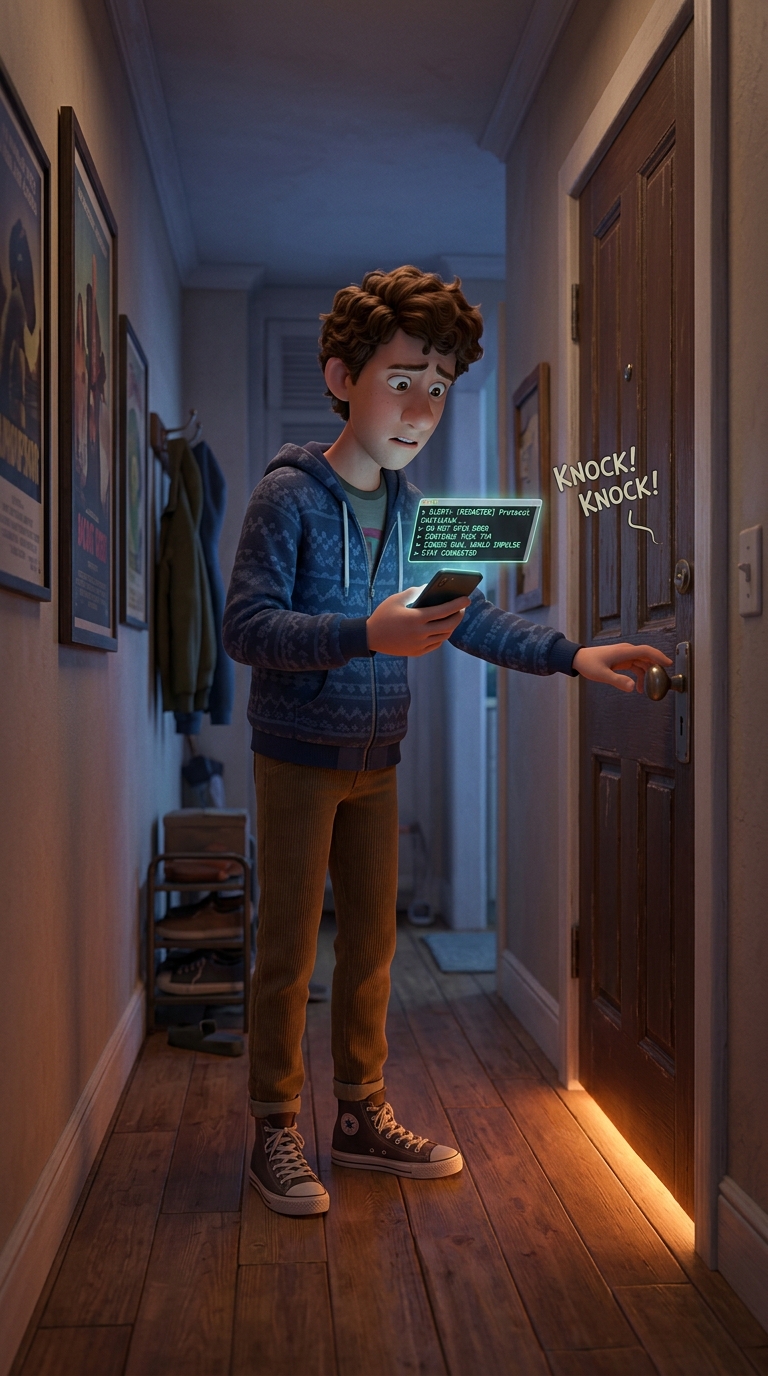 Art style: 3D анимация Pixar. Макс стоит у входной двери, не решаясь ее открыть. Слышен настойчивый стук. Он смотрит на телефон в руке. На экране телефона бежит текст с командами. Макс разрывается между реальным миром за дверью и цифровой тюрьмой в руке. Свет из-под двери кажется теплым и спасительным. ━━━━━━━━━━━━━━━━━━━━━━━━━━━━━━━━━━━━━━ FINAL STYLE ENFORCEMENT (this is the authoritative rendering directive — it overrides any style wording elsewhere in the prompt): Render this image entirely in "3D анимация Pixar" style. Match the lighting grammar, material response, colour science, level of realism / stylisation, line weight, and shading model typical of "3D анимация Pixar". Keep the subject, composition, camera angle, lighting direction, and colour palette from the description above — but EVERY surface, skin, fabric, material, and environmental element must be rendered in the "3D анимация Pixar" idiom, not in any other medium.