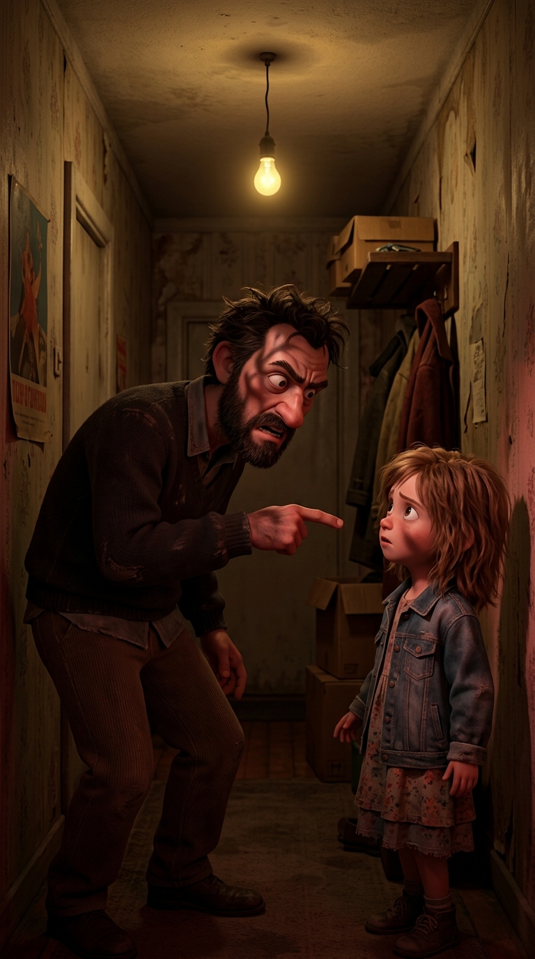 Art style: 3D Pixar. Коридор квартиры 90-х: облупленные стены, тусклая лампа. Средний план с уровня глаз. Свет от лампы — жёлтый, дрожащий, тени искажают лица. Атмосфера паранойи и угрозы. Отец тычет пальцем в Тасю, глаза безумные. Палитра тёмно-красных теней с #FF6F61. ━━━━━━━━━━━━━━━━━━━━━━━━━━━━━━━━━━━━━━ FINAL STYLE ENFORCEMENT (this is the authoritative rendering directive — it overrides any style wording elsewhere in the prompt): Render this image entirely in "3D Pixar" style. Match the lighting grammar, material response, colour science, level of realism / stylisation, line weight, and shading model typical of "3D Pixar". Keep the subject, composition, camera angle, lighting direction, and colour palette from the description above — but EVERY surface, skin, fabric, material, and environmental element must be rendered in the "3D Pixar" idiom, not in any other medium. Character appearance reference (MUST match exactly): - Тася: Шестилетняя девочка с бледным лицом, большими испуганными глазами цвета серого неба, тонкими чертами лица, растрёпанными светло-каштановыми волосами до плеч, запутанными от постоянного стресса. Худенькое телосложение, сутулая осанка от страха. Одета в потрёпанную одежду 90-х: выцветшее платье с цветочками, старые кеды. Выражение лица — смесь ужаса и решимости, губы плотно сжаты. Фон — тесная квартира 90-х с обшарпанными обоями, тусклым светом от лампочки без плафона. Атмосфера одиночества и холода. Портрет в стиле реалистичной живописи, мягкое рассеянное освещение, подчёркивающее тени под глазами, детализированные эмоции. - Отец: Мужчина около 40 лет, крепкого телосложения с красным опухшим лицом, заросшей щетиной, налитыми кровью глазами, спутанными тёмными волосами. Агрессивная поза, сжатые кулаки, рот в гримасе ярости. Одет в мятый свитер 90-х и штаны, пропахший алкоголем. Фон — сумрачная кухня квартиры 90-х с бутылками на столе, разбитой посудой. Атмосфера угрозы и безумия. Портрет в стиле реалистичной живописи, драматическое освещение снизу, тени усиливает гнев, высокая детализация черт. Brand guidelines: Brand color palette: #FF6F61. Use these colors prominently in the composition.