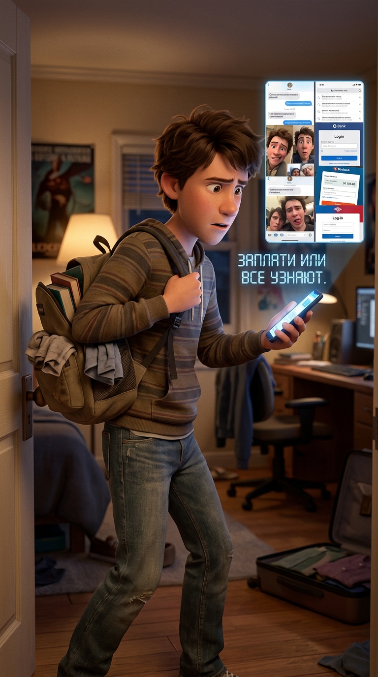 Art style: 3D анимация Pixar. Решившись, Макс хватает рюкзак и бросает в него несколько вещей. Он направляется к выходу. В этот момент телефон в его руке вспыхивает. На экране начинают мелькать самые личные файлы Макса: скриншоты переписок, неловкие фото, история поиска, банковские приложения. Это ультиматум. ━━━━━━━━━━━━━━━━━━━━━━━━━━━━━━━━━━━━━━ FINAL STYLE ENFORCEMENT (this is the authoritative rendering directive — it overrides any style wording elsewhere in the prompt): Render this image entirely in "3D анимация Pixar" style. Match the lighting grammar, material response, colour science, level of realism / stylisation, line weight, and shading model typical of "3D анимация Pixar". Keep the subject, composition, camera angle, lighting direction, and colour palette from the description above — but EVERY surface, skin, fabric, material, and environmental element must be rendered in the "3D анимация Pixar" idiom, not in any other medium.