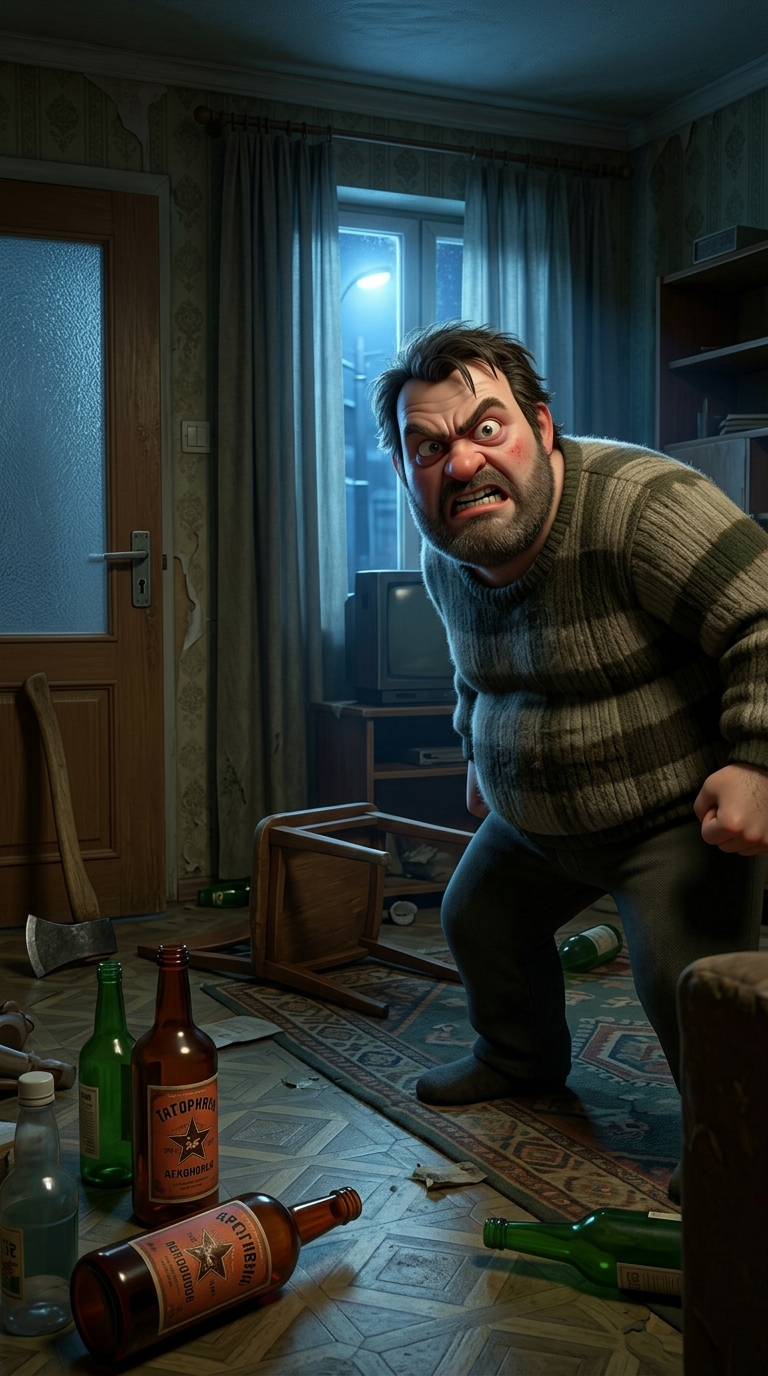 Art style: 3D Pixar. Гостиная квартиры 90-х ночью: бутылки на полу, перевёрнутый стул, топор у двери. Крупный план с низкого угла на отца. Свет от уличного фонаря через щель в шторах — холодный синий. Атмосфера безумия и ужаса. Отец с налитыми глазами рычит. Палитра тёмных, грязных тонов с #FF6F61 в этикетке бутылки. ━━━━━━━━━━━━━━━━━━━━━━━━━━━━━━━━━━━━━━ FINAL STYLE ENFORCEMENT (this is the authoritative rendering directive — it overrides any style wording elsewhere in the prompt): Render this image entirely in "3D Pixar" style. Match the lighting grammar, material response, colour science, level of realism / stylisation, line weight, and shading model typical of "3D Pixar". Keep the subject, composition, camera angle, lighting direction, and colour palette from the description above — but EVERY surface, skin, fabric, material, and environmental element must be rendered in the "3D Pixar" idiom, not in any other medium. Character appearance reference (MUST match exactly): - Тася: Шестилетняя девочка с бледным лицом, большими испуганными глазами цвета серого неба, тонкими чертами лица, растрёпанными светло-каштановыми волосами до плеч, запутанными от постоянного стресса. Худенькое телосложение, сутулая осанка от страха. Одета в потрёпанную одежду 90-х: выцветшее платье с цветочками, старые кеды. Выражение лица — смесь ужаса и решимости, губы плотно сжаты. Фон — тесная квартира 90-х с обшарпанными обоями, тусклым светом от лампочки без плафона. Атмосфера одиночества и холода. Портрет в стиле реалистичной живописи, мягкое рассеянное освещение, подчёркивающее тени под глазами, детализированные эмоции. - Отец: Мужчина около 40 лет, крепкого телосложения с красным опухшим лицом, заросшей щетиной, налитыми кровью глазами, спутанными тёмными волосами. Агрессивная поза, сжатые кулаки, рот в гримасе ярости. Одет в мятый свитер 90-х и штаны, пропахший алкоголем. Фон — сумрачная кухня квартиры 90-х с бутылками на столе, разбитой посудой. Атмосфера угрозы и безумия. Портрет в стиле реалистичной живописи, драматическое освещение снизу, тени усиливает гнев, высокая детализация черт. Brand guidelines: Brand color palette: #FF6F61. Use these colors prominently in the composition.