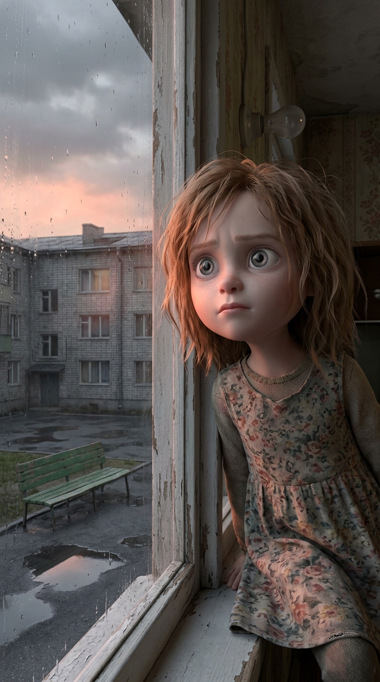 Art style: 3D Pixar. Двор дома 90-х: скамейка, лужи, серое небо. Крупный план лица Таси у окна. Мягкий свет заката пробивается сквозь тучи. Атмосфера внутренней борьбы и надежды. Тася смотрит вдаль, глаза горят решимостью. Палитра холодных с тёплым #FF6F61. ━━━━━━━━━━━━━━━━━━━━━━━━━━━━━━━━━━━━━━ FINAL STYLE ENFORCEMENT (this is the authoritative rendering directive — it overrides any style wording elsewhere in the prompt): Render this image entirely in "3D Pixar" style. Match the lighting grammar, material response, colour science, level of realism / stylisation, line weight, and shading model typical of "3D Pixar". Keep the subject, composition, camera angle, lighting direction, and colour palette from the description above — but EVERY surface, skin, fabric, material, and environmental element must be rendered in the "3D Pixar" idiom, not in any other medium. Character appearance reference (MUST match exactly): - Тася: Шестилетняя девочка с бледным лицом, большими испуганными глазами цвета серого неба, тонкими чертами лица, растрёпанными светло-каштановыми волосами до плеч, запутанными от постоянного стресса. Худенькое телосложение, сутулая осанка от страха. Одета в потрёпанную одежду 90-х: выцветшее платье с цветочками, старые кеды. Выражение лица — смесь ужаса и решимости, губы плотно сжаты. Фон — тесная квартира 90-х с обшарпанными обоями, тусклым светом от лампочки без плафона. Атмосфера одиночества и холода. Портрет в стиле реалистичной живописи, мягкое рассеянное освещение, подчёркивающее тени под глазами, детализированные эмоции. Brand guidelines: Brand color palette: #FF6F61. Use these colors prominently in the composition.