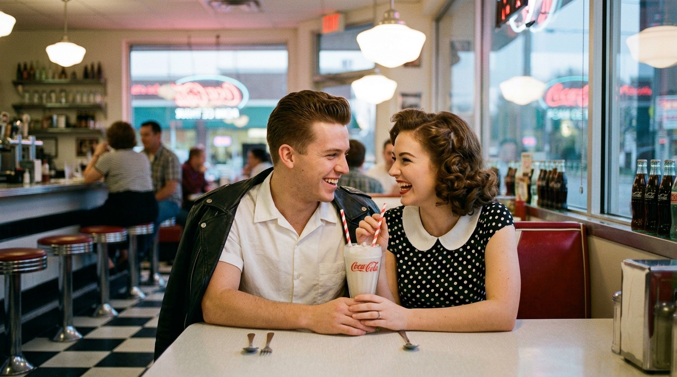 Art style: Realistic cinematic vintage 1950s. Inside a classic 1950s diner with checkered floors and vinyl booths. A young man and woman sit across from each other, sharing tall milkshakes with straws. They are laughing and looking into each other's eyes. The lighting is warm and inviting, with soft overhead lamps and the glow of neon signs visible through the windows. The atmosphere is intimate and romantic. ━━━━━━━━━━━━━━━━━━━━━━━━━━━━━━━━━━━━━━ FINAL STYLE ENFORCEMENT (this is the authoritative rendering directive — it overrides any style wording elsewhere in the prompt): Render this image entirely in "Realistic cinematic vintage 1950s" style. Match the lighting grammar, material response, colour science, level of realism / stylisation, line weight, and shading model typical of "Realistic cinematic vintage 1950s". Keep the subject, composition, camera angle, lighting direction, and colour palette from the description above — but EVERY surface, skin, fabric, material, and environmental element must be rendered in the "Realistic cinematic vintage 1950s" idiom, not in any other medium. Character appearance reference (MUST match exactly): - James: A young man in his early 20s with a clean-cut appearance, featuring short, neatly styled brown hair in a classic 1950s pompadour. He has a lean, athletic build and expressive blue eyes. He wears a crisp white short-sleeved button-down shirt tucked into dark slacks, and later a rugged black leather jacket. His expression is often joyful and full of life. The lighting is warm and nostalgic, evoking a cinematic 1950s aesthetic with soft shadows and a rich color palette. - Betty: A young woman in her early 20s with shoulder-length, curled brunette hair styled in a 1950s fashion. She has a bright, infectious smile and warm brown eyes. Her outfits include a black and white polka-dot dress with a white collar, a teal cardigan over a white blouse, and a light blue short-sleeved top with a pink flared skirt. The setting is a nostalgic 1950s town with vibrant neon lights and classic diners. The style is realistic and cinematic, with a soft, glowing light that highlights her features.