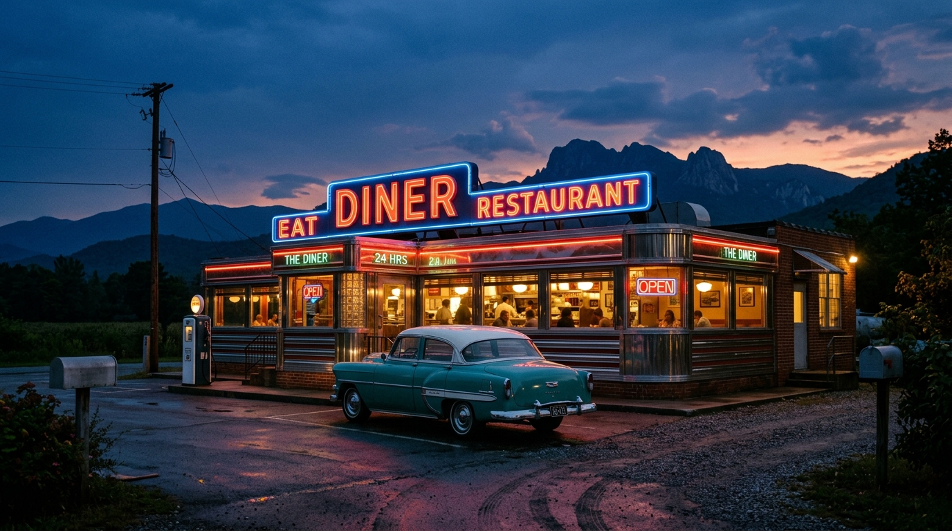 Art style: Realistic cinematic vintage 1950s. An exterior shot of a classic 1950s roadside diner at dusk. The building is adorned with bright blue and red neon signs that say "Diner" and "Restaurant." A vintage car is parked in front. The sky is a deep twilight blue, and mountains are visible in the distance. The overall mood is nostalgic and peaceful. ━━━━━━━━━━━━━━━━━━━━━━━━━━━━━━━━━━━━━━ FINAL STYLE ENFORCEMENT (this is the authoritative rendering directive — it overrides any style wording elsewhere in the prompt): Render this image entirely in "Realistic cinematic vintage 1950s" style. Match the lighting grammar, material response, colour science, level of realism / stylisation, line weight, and shading model typical of "Realistic cinematic vintage 1950s". Keep the subject, composition, camera angle, lighting direction, and colour palette from the description above — but EVERY surface, skin, fabric, material, and environmental element must be rendered in the "Realistic cinematic vintage 1950s" idiom, not in any other medium.