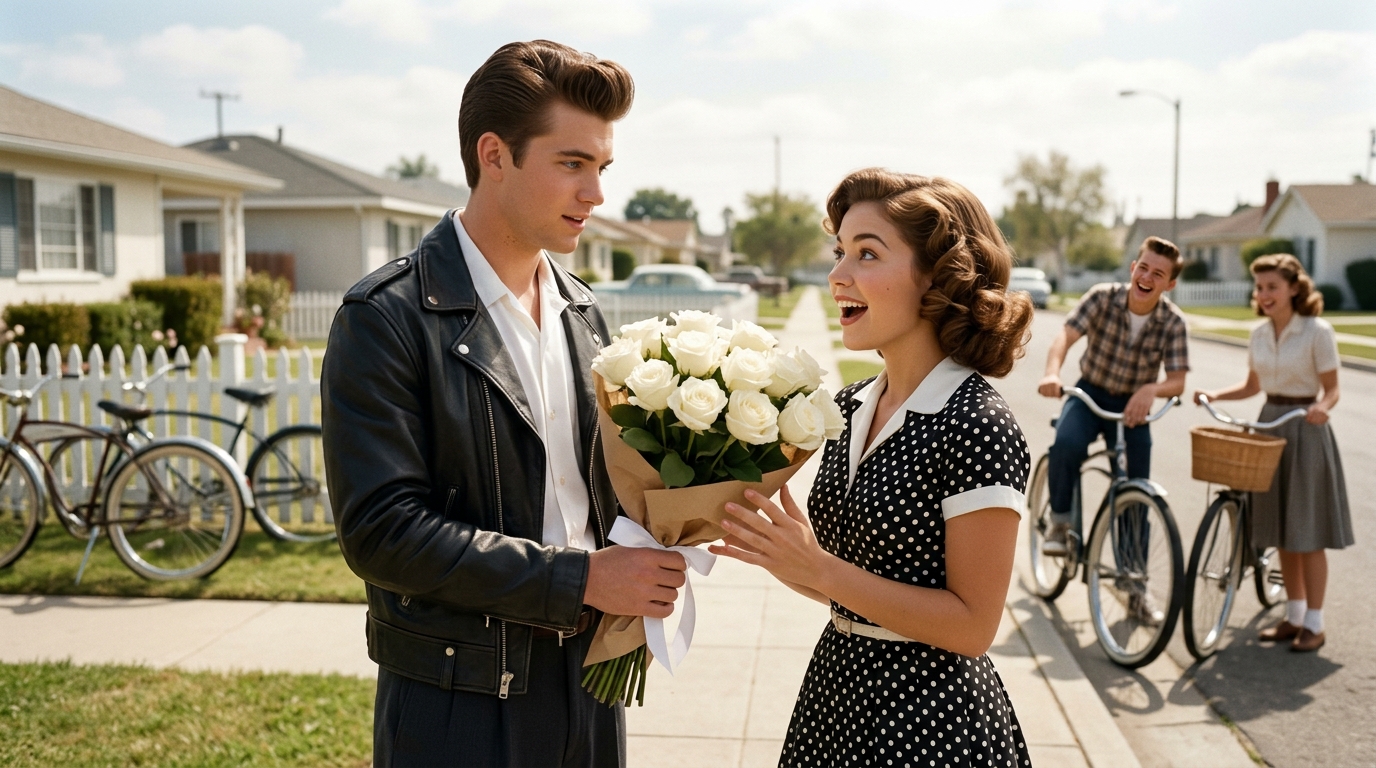 Art style: Realistic cinematic vintage 1950s. A sunny daytime scene on a residential street with white picket fences and bicycles. A young man in a leather jacket presents a large bouquet of white roses to a young woman. She looks surprised and delighted. In the background, other teenagers are seen with their bikes, adding to the wholesome, small-town 1950s vibe. The lighting is bright and natural. ━━━━━━━━━━━━━━━━━━━━━━━━━━━━━━━━━━━━━━ FINAL STYLE ENFORCEMENT (this is the authoritative rendering directive — it overrides any style wording elsewhere in the prompt): Render this image entirely in "Realistic cinematic vintage 1950s" style. Match the lighting grammar, material response, colour science, level of realism / stylisation, line weight, and shading model typical of "Realistic cinematic vintage 1950s". Keep the subject, composition, camera angle, lighting direction, and colour palette from the description above — but EVERY surface, skin, fabric, material, and environmental element must be rendered in the "Realistic cinematic vintage 1950s" idiom, not in any other medium. Character appearance reference (MUST match exactly): - James: A young man in his early 20s with a clean-cut appearance, featuring short, neatly styled brown hair in a classic 1950s pompadour. He has a lean, athletic build and expressive blue eyes. He wears a crisp white short-sleeved button-down shirt tucked into dark slacks, and later a rugged black leather jacket. His expression is often joyful and full of life. The lighting is warm and nostalgic, evoking a cinematic 1950s aesthetic with soft shadows and a rich color palette. - Betty: A young woman in her early 20s with shoulder-length, curled brunette hair styled in a 1950s fashion. She has a bright, infectious smile and warm brown eyes. Her outfits include a black and white polka-dot dress with a white collar, a teal cardigan over a white blouse, and a light blue short-sleeved top with a pink flared skirt. The setting is a nostalgic 1950s town with vibrant neon lights and classic diners. The style is realistic and cinematic, with a soft, glowing light that highlights her features.