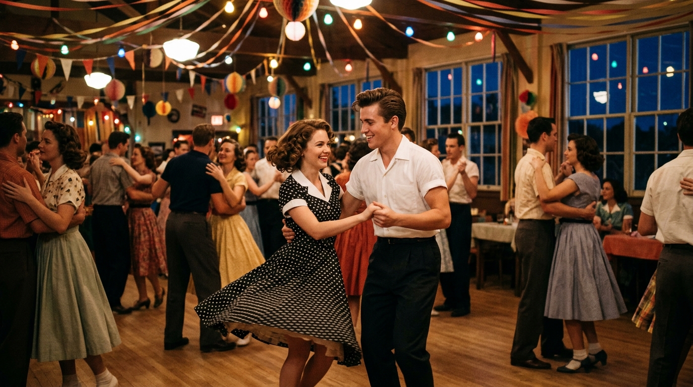 Art style: Realistic cinematic vintage 1950s. A crowded 1950s dance hall decorated with colorful streamers and flags. A young man and woman are in the center, performing a lively swing dance. Other couples are dancing around them, creating a scene of vibrant social activity. The lighting is festive, with warm indoor lights and a hint of the night sky through the windows. ━━━━━━━━━━━━━━━━━━━━━━━━━━━━━━━━━━━━━━ FINAL STYLE ENFORCEMENT (this is the authoritative rendering directive — it overrides any style wording elsewhere in the prompt): Render this image entirely in "Realistic cinematic vintage 1950s" style. Match the lighting grammar, material response, colour science, level of realism / stylisation, line weight, and shading model typical of "Realistic cinematic vintage 1950s". Keep the subject, composition, camera angle, lighting direction, and colour palette from the description above — but EVERY surface, skin, fabric, material, and environmental element must be rendered in the "Realistic cinematic vintage 1950s" idiom, not in any other medium. Character appearance reference (MUST match exactly): - James: A young man in his early 20s with a clean-cut appearance, featuring short, neatly styled brown hair in a classic 1950s pompadour. He has a lean, athletic build and expressive blue eyes. He wears a crisp white short-sleeved button-down shirt tucked into dark slacks, and later a rugged black leather jacket. His expression is often joyful and full of life. The lighting is warm and nostalgic, evoking a cinematic 1950s aesthetic with soft shadows and a rich color palette. - Betty: A young woman in her early 20s with shoulder-length, curled brunette hair styled in a 1950s fashion. She has a bright, infectious smile and warm brown eyes. Her outfits include a black and white polka-dot dress with a white collar, a teal cardigan over a white blouse, and a light blue short-sleeved top with a pink flared skirt. The setting is a nostalgic 1950s town with vibrant neon lights and classic diners. The style is realistic and cinematic, with a soft, glowing light that highlights her features.