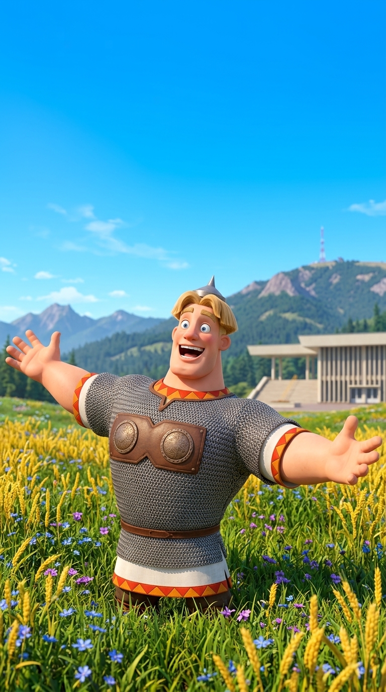 Strong rule: style --- 3D Pixar ---. Strong rule: style --- 3D Pixar ---. Мужчина около 40 лет, крепкого коренастого телосложения с круглым лицом и светлой кожей. У него короткие светлые волосы, скрытые под черной бейсболкой с объемной цифрой «26», и светлые глаза. Одет в полностью черный спортивный образ: куртку-бомбер на молнии, джоггеры Nike и кроссовки. На левом запястье надеты крупные серебристые часы. Он стоит в уверенной позе, упираясь левой рукой в бок и удерживая на правом плече серую голову лошади. Выражение лица спокойное, взгляд прямой и серьезный.