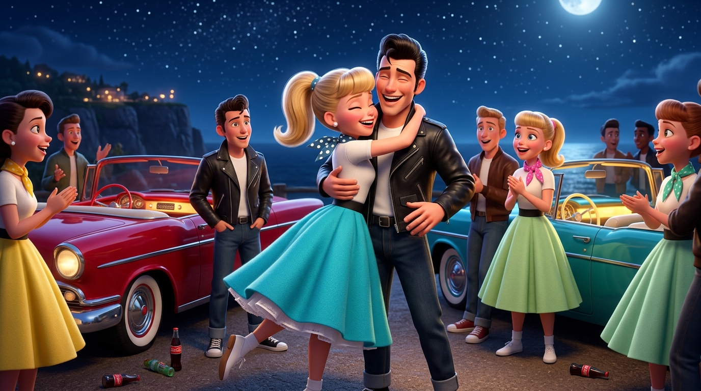 Art style: Realistic cinematic vintage 1950s. The exterior of the neon-lit diner at night. Two young couples burst out of the front door, laughing and holding hands. They begin to dance and run across the parking lot. The glow from the diner's windows and signs illuminates their joyful movements. The atmosphere is electric and full of youthful energy. ━━━━━━━━━━━━━━━━━━━━━━━━━━━━━━━━━━━━━━ FINAL STYLE ENFORCEMENT (this is the authoritative rendering directive — it overrides any style wording elsewhere in the prompt): Render this image entirely in "Realistic cinematic vintage 1950s" style. Match the lighting grammar, material response, colour science, level of realism / stylisation, line weight, and shading model typical of "Realistic cinematic vintage 1950s". Keep the subject, composition, camera angle, lighting direction, and colour palette from the description above — but EVERY surface, skin, fabric, material, and environmental element must be rendered in the "Realistic cinematic vintage 1950s" idiom, not in any other medium. Character appearance reference (MUST match exactly): - James: A young man in his early 20s with a clean-cut appearance, featuring short, neatly styled brown hair in a classic 1950s pompadour. He has a lean, athletic build and expressive blue eyes. He wears a crisp white short-sleeved button-down shirt tucked into dark slacks, and later a rugged black leather jacket. His expression is often joyful and full of life. The lighting is warm and nostalgic, evoking a cinematic 1950s aesthetic with soft shadows and a rich color palette. - Betty: A young woman in her early 20s with shoulder-length, curled brunette hair styled in a 1950s fashion. She has a bright, infectious smile and warm brown eyes. Her outfits include a black and white polka-dot dress with a white collar, a teal cardigan over a white blouse, and a light blue short-sleeved top with a pink flared skirt. The setting is a nostalgic 1950s town with vibrant neon lights and classic diners. The style is realistic and cinematic, with a soft, glowing light that highlights her features.